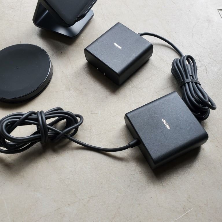 2 AS NEW UBIOLABS 15W MOBILE DEVICE BUNDLE CHARGING DOCKS ONE ADJUSTABLE, ONE PAD RETAIL $120 BOTH HAVE WIRELESS CHARGING
