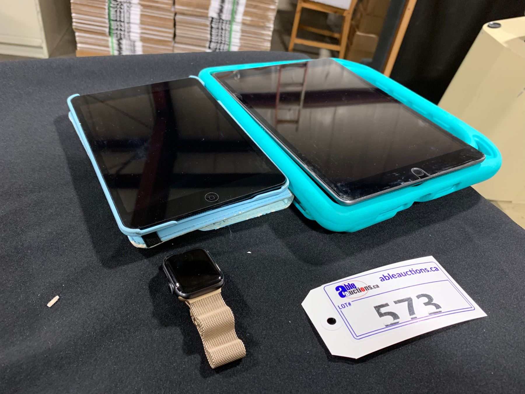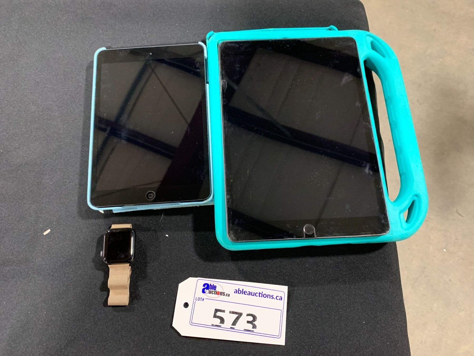 2 ASSORTED APPLE IPAD WITH BACK COVER & APPLE WATCH