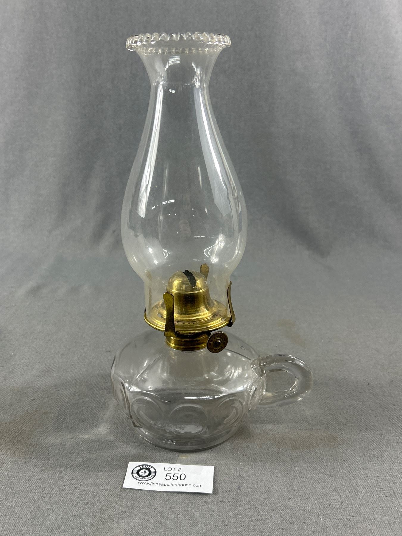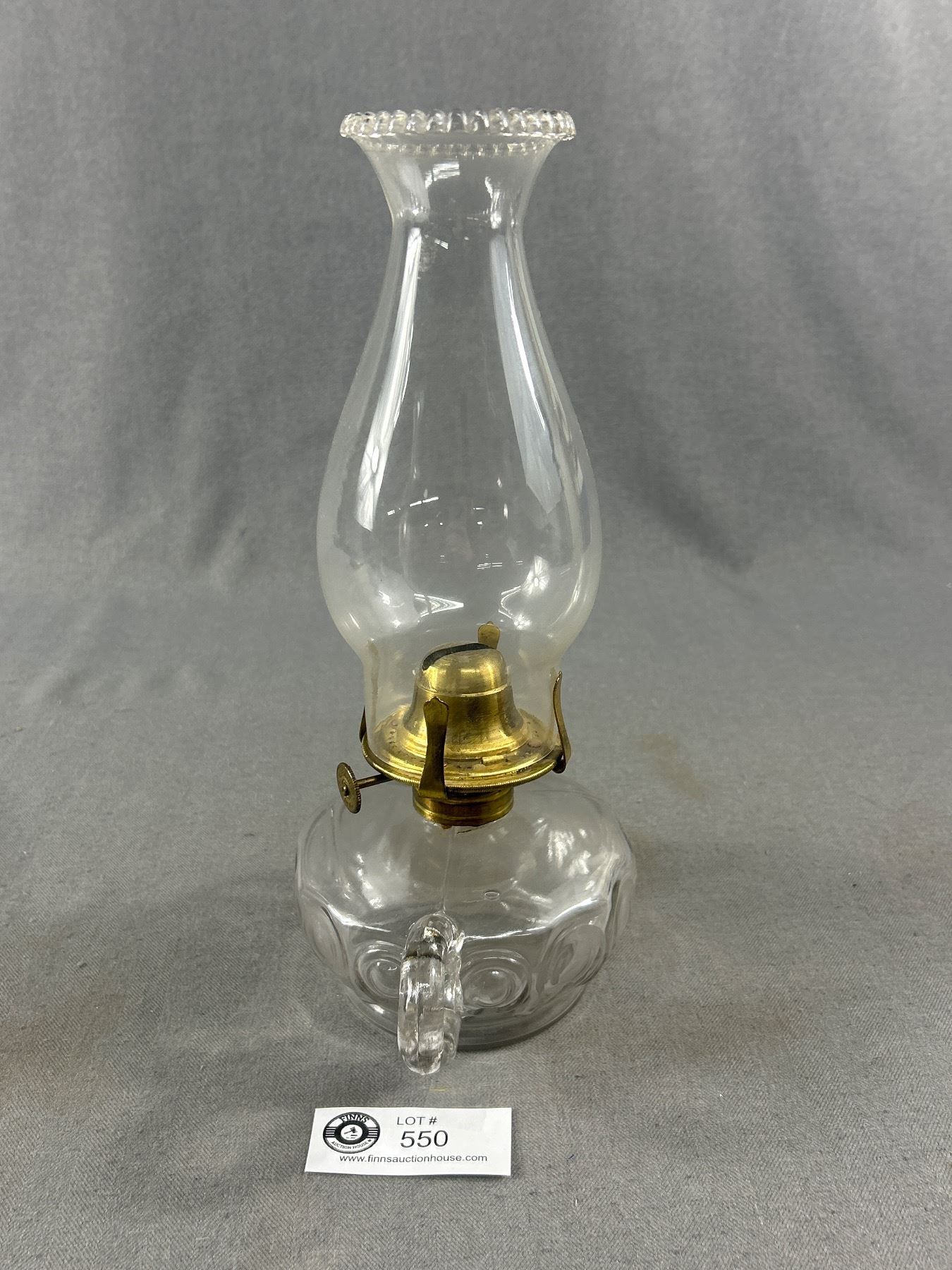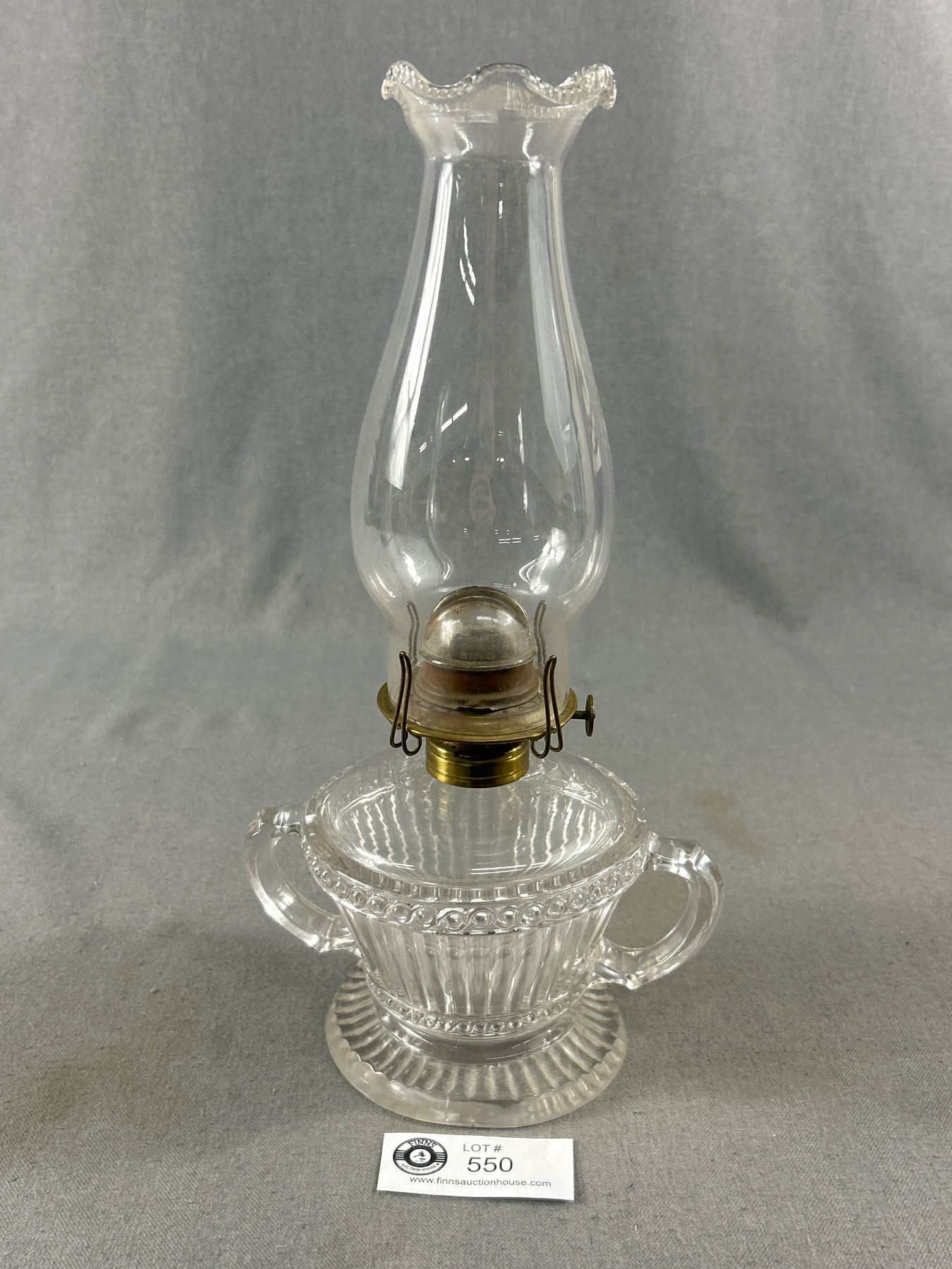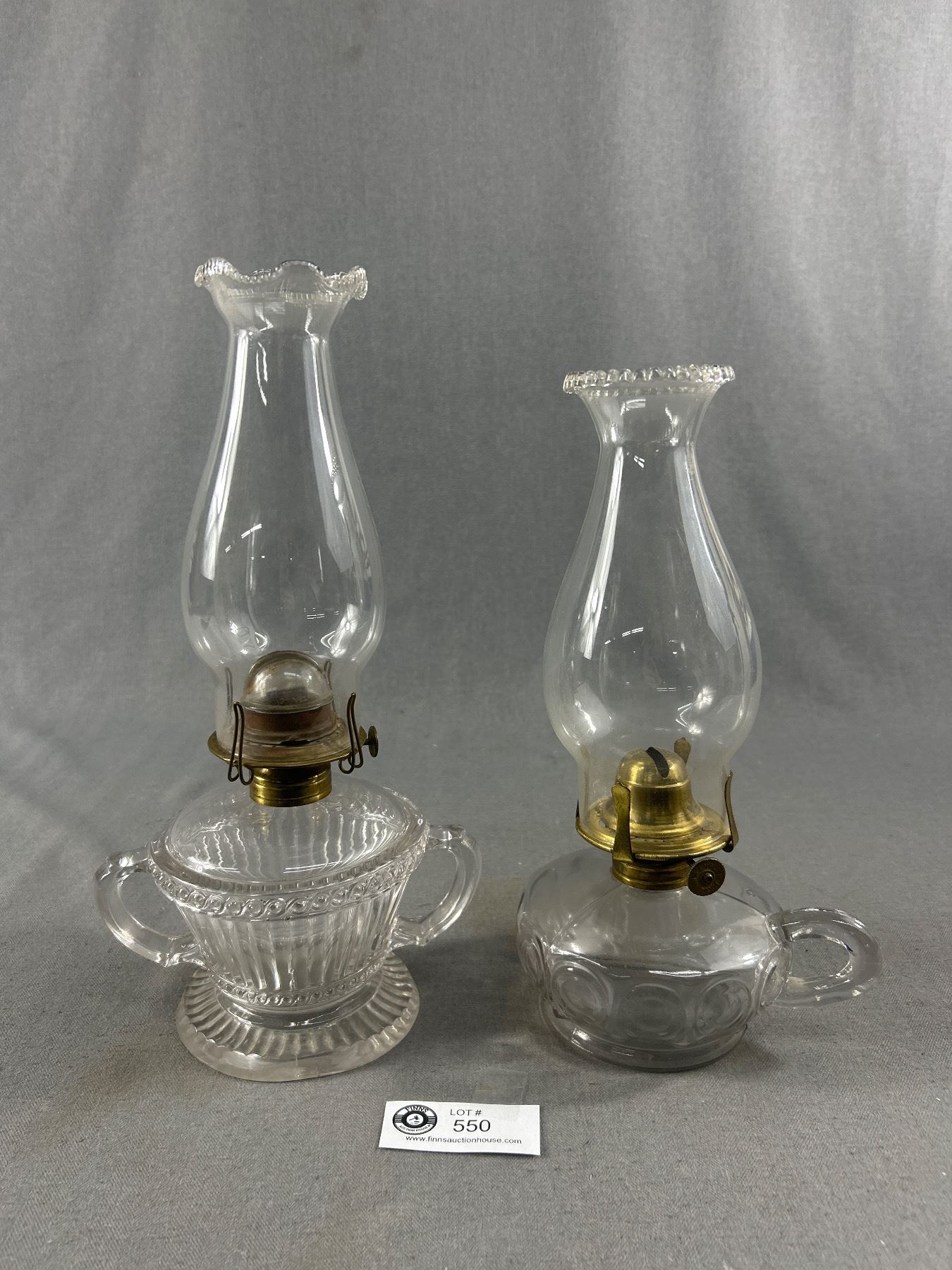 2 Antique Clear Glass Oil Lamps - Double Handle Approx. 12.5" H & English Made Finger Lamp Is Approx. 11"H