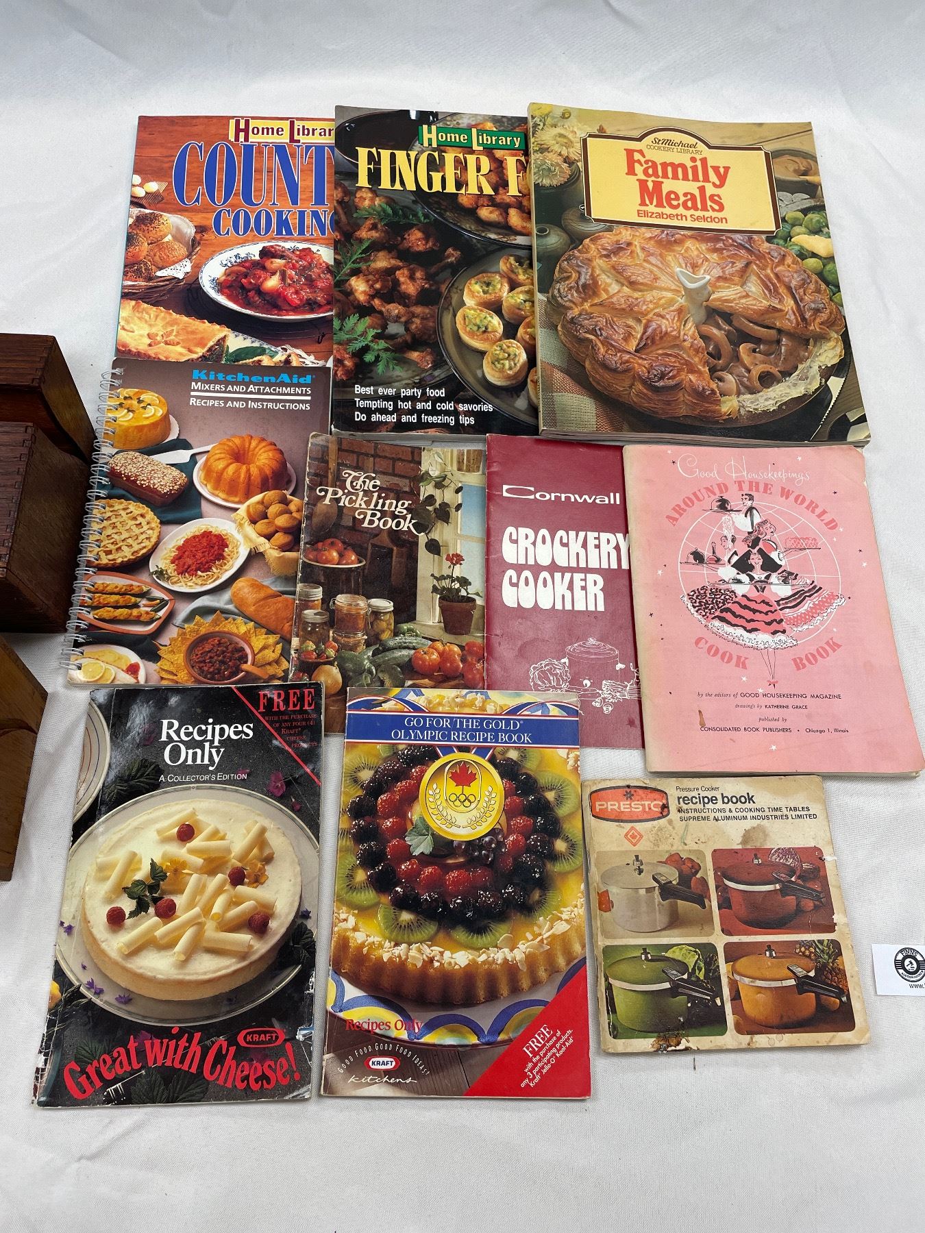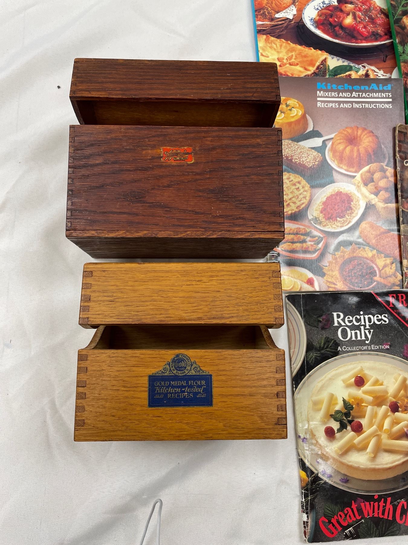 2 Antique Finger Jointed Wooden Recipe Boxes and Asst of Vintage Cookbooks and Recipe Magazines