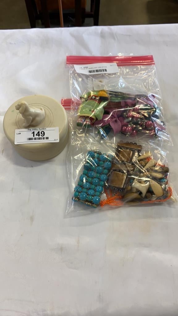 2 BAGS OF JEWELLERY AND STONE CONTAINER W/ CONTENTS