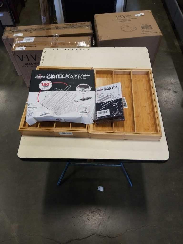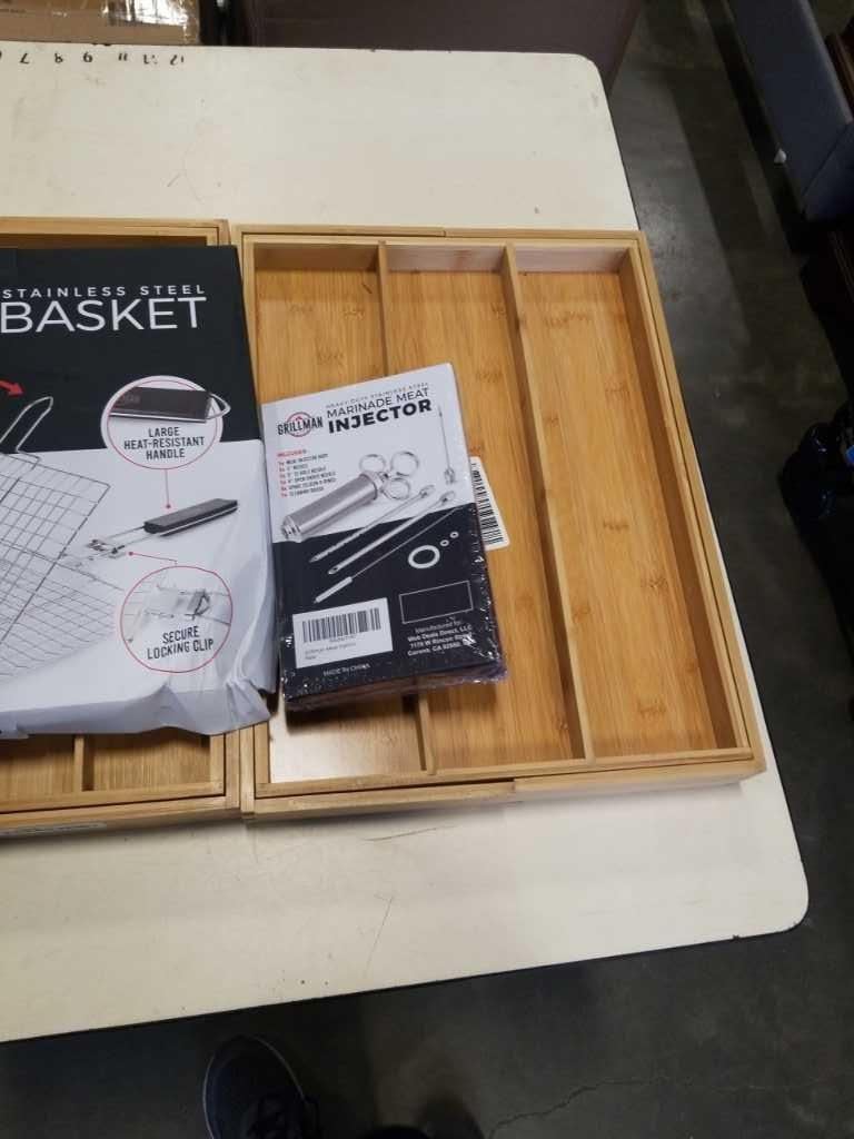 2 BAMBOO CUTLERY TRAYS, GRILL BASKET, AND MEAT INJECTOR