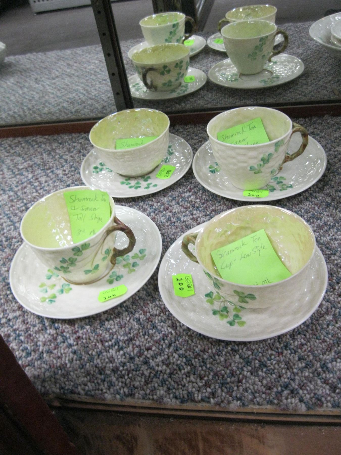 2 BELLEEK SHAMROCK TEACUP & SAUCER TALL SHAPE 3RD MARK & 2 SHAMROCK TEACUP LOW STYLE 2ND MARK