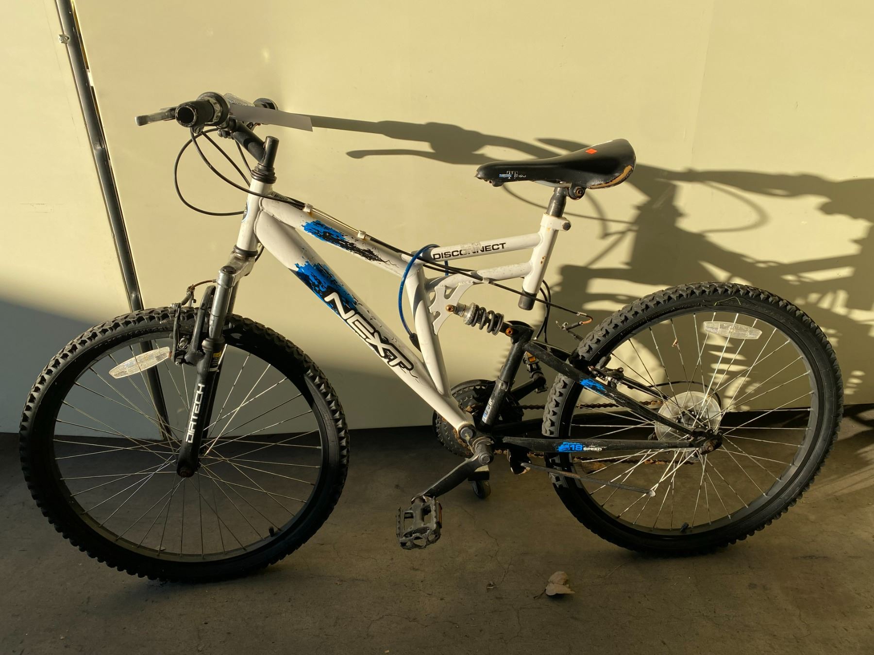 2 BIKES - NO NAME BLACK FIXED GEAR STUNT BIKE AND NEXT DISCONNECT WHITE 18 SPEED FULL SUSPENSION MOUNTAIN BIKE (LOOSE HANDLEBAR)