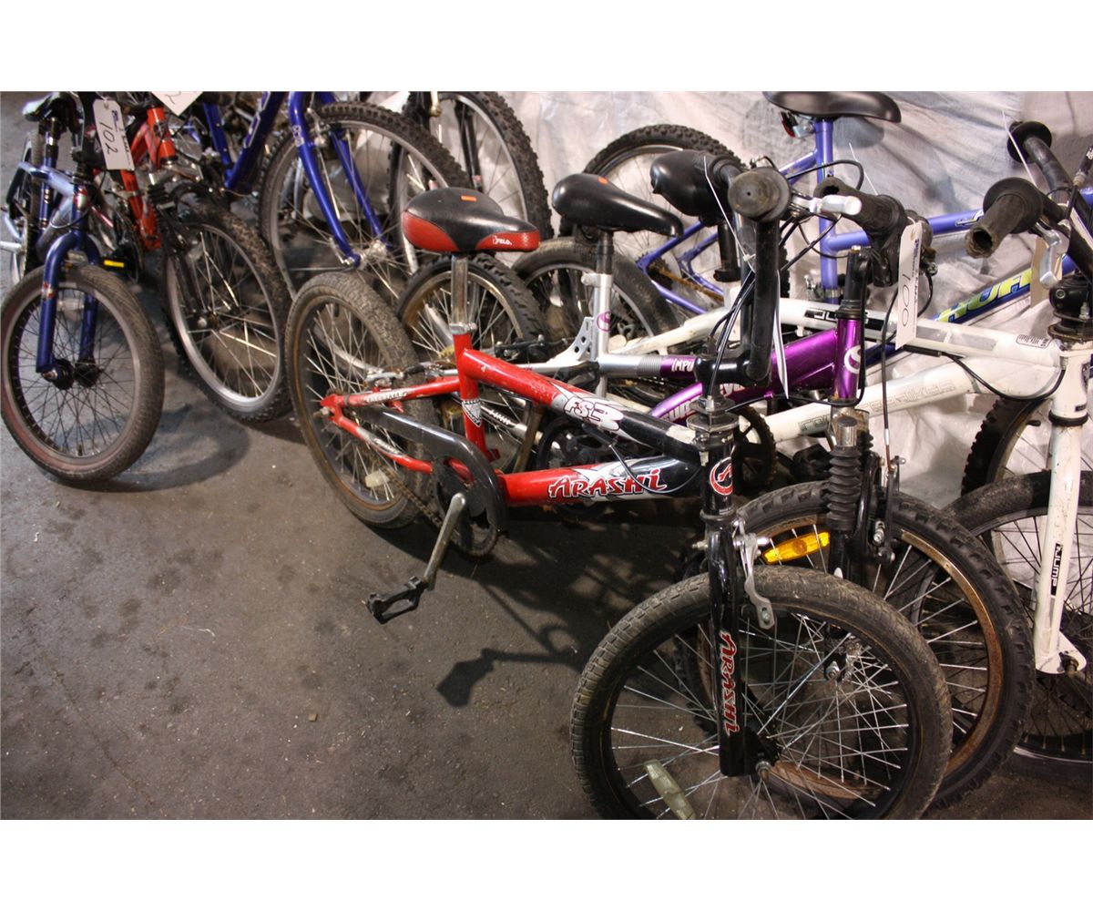 2 BIKES: RED ARASHI STUNT BIKE AND PURPLE SUPERCYCLE 5 SPEED FRONT SUSPENSION MOUNTAIN BIKE