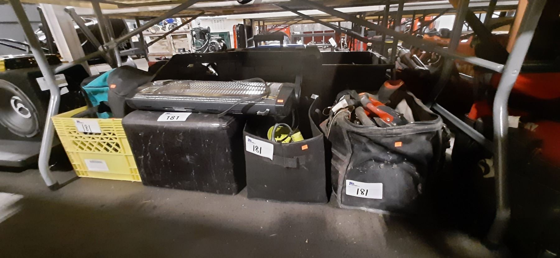 2 BINS OF ASSORTED POWER TOOLS, JOBSITE LIGHTING ASSORTED CARRY CASES, PADDED FOOT REST AND PORTABLE ELECTRIC SPACE HEATER