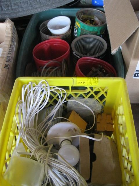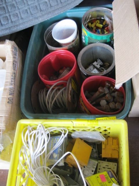2 BINS OF ASST. WIRE ELECTRICAL, LG. LAG BOLTS, ETC.