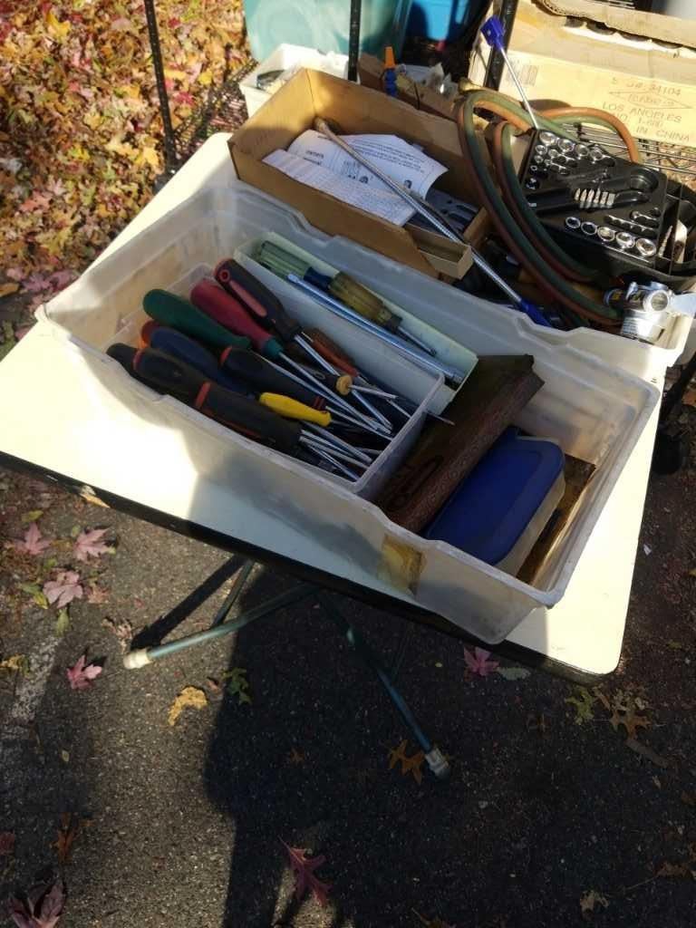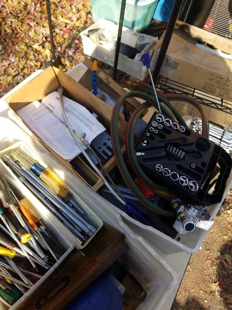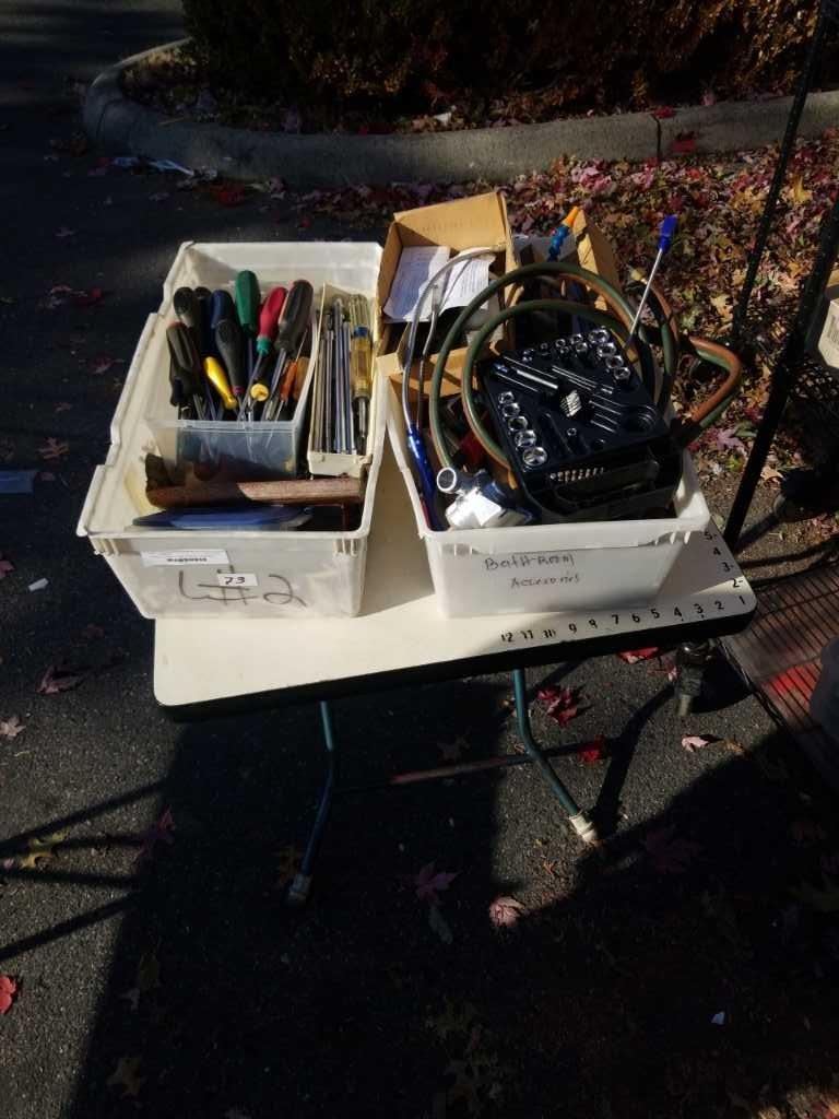 2 BINS OF HAND TOOLS, SOCKETS, CONTOUR GUAGE AND MORE