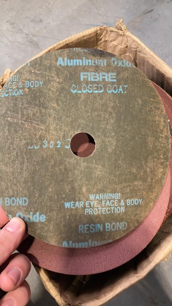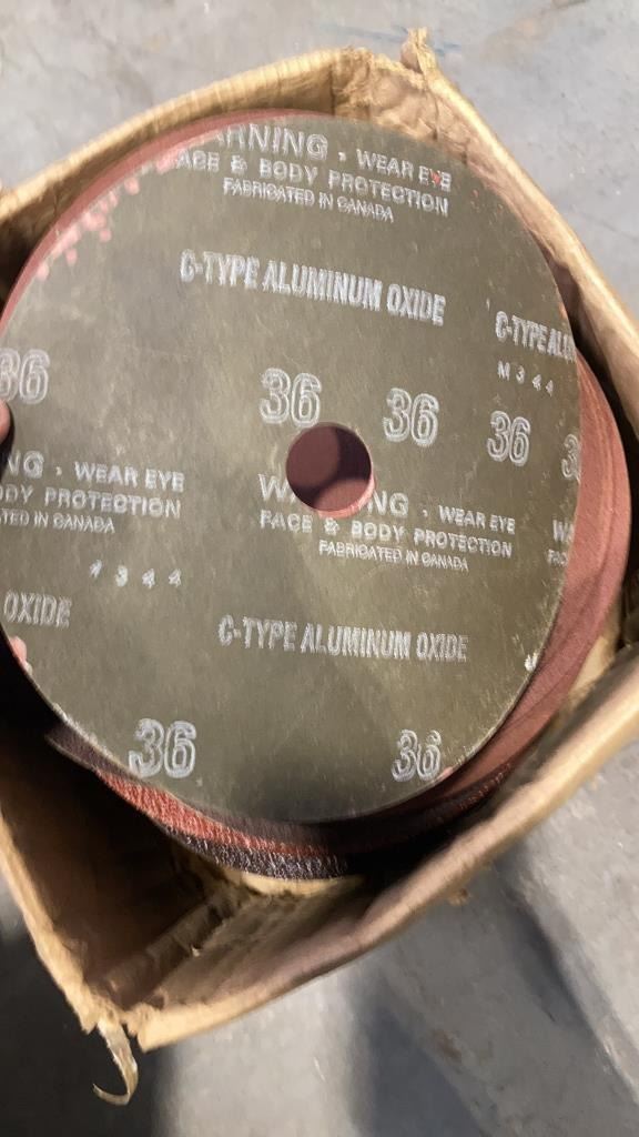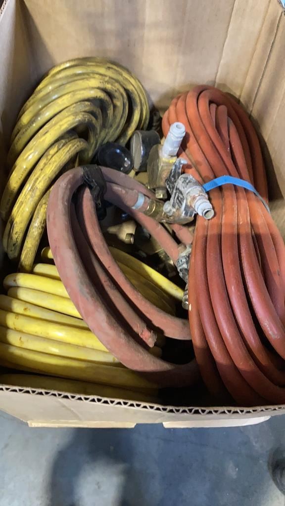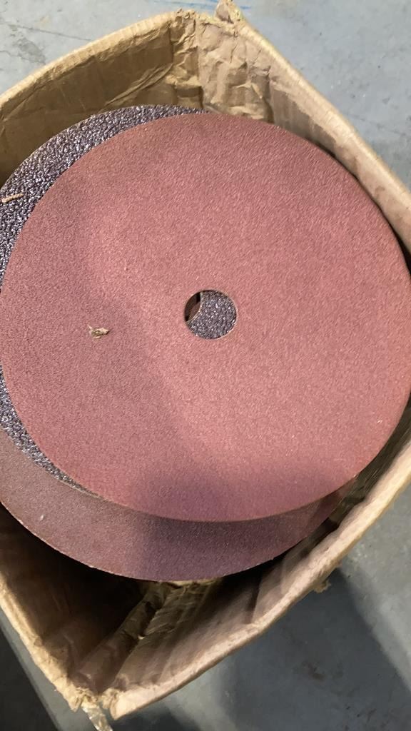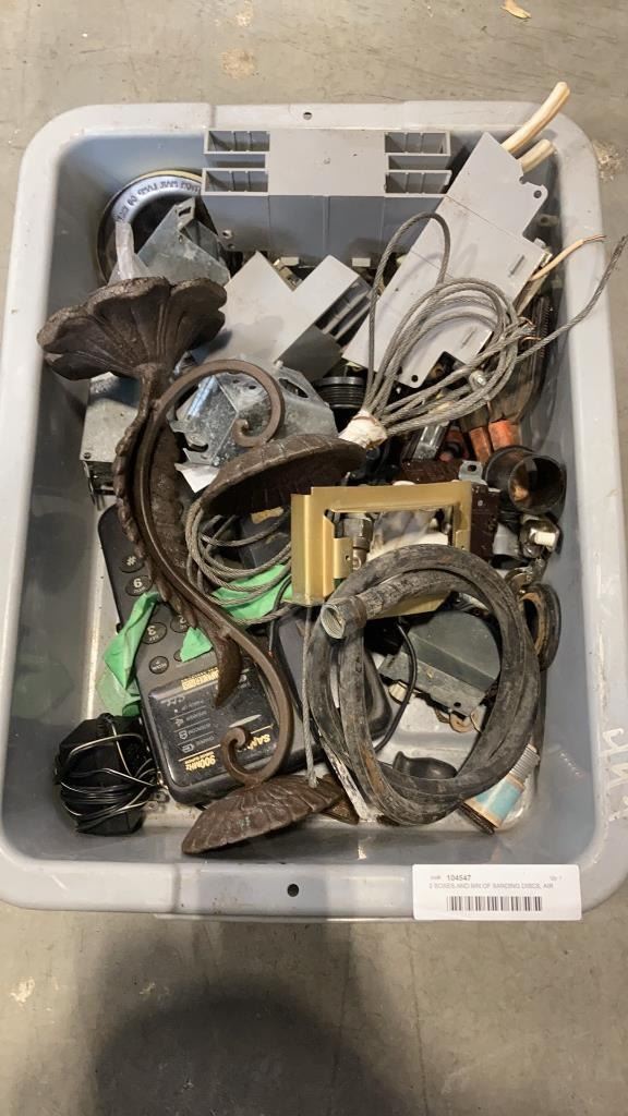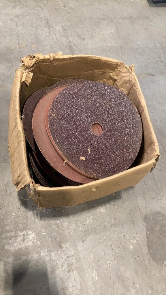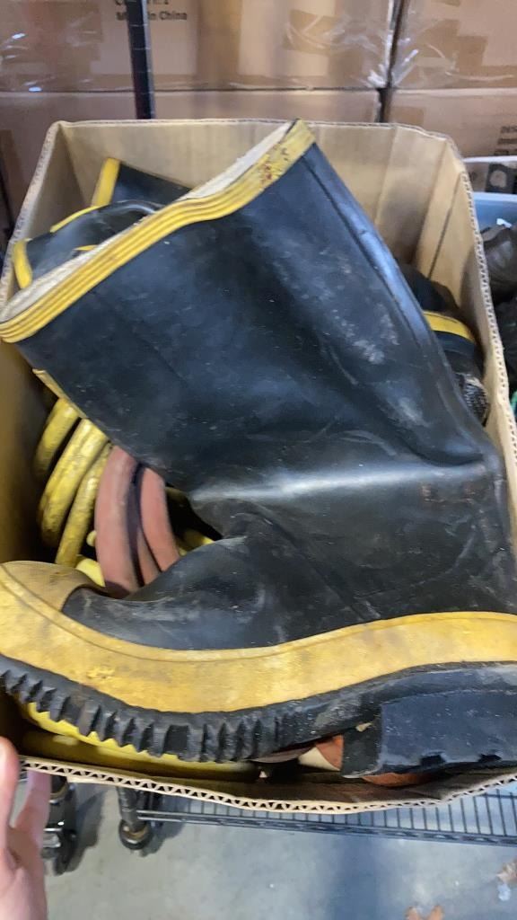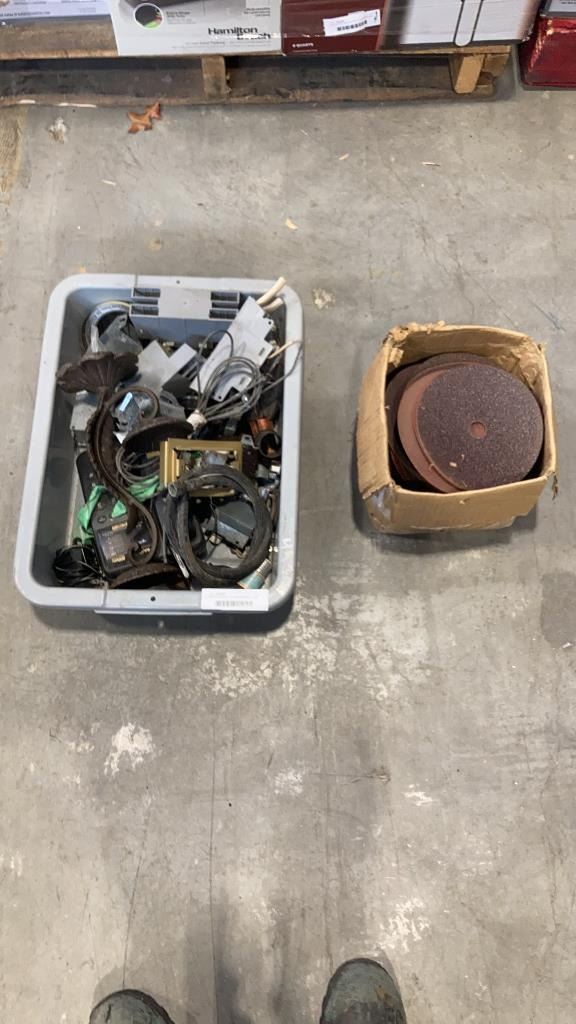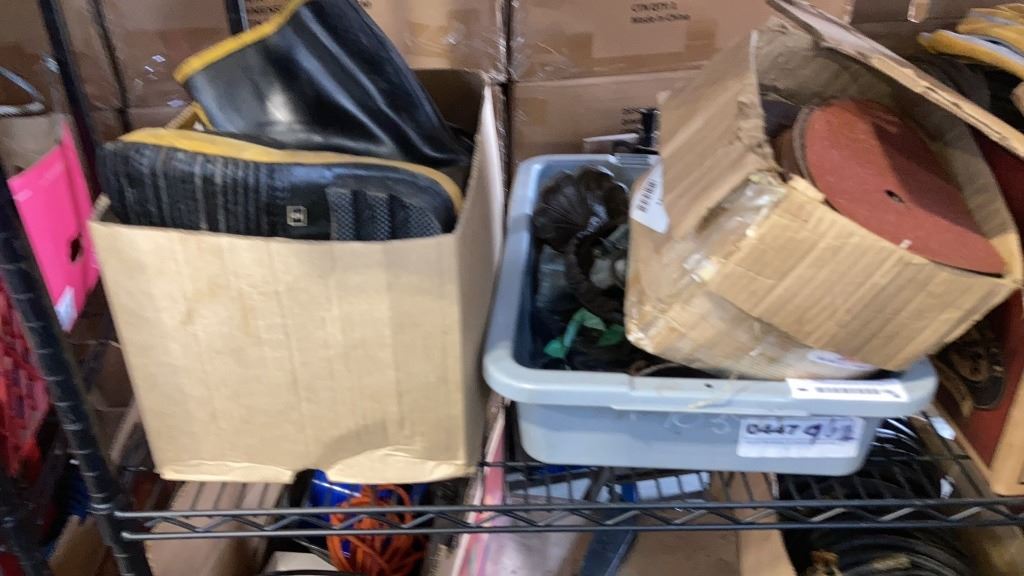 2 BOXES AND BIN OF SANDING DISCS, AIR HOSES AND STEEL TOE SIZE NINE BOOTS