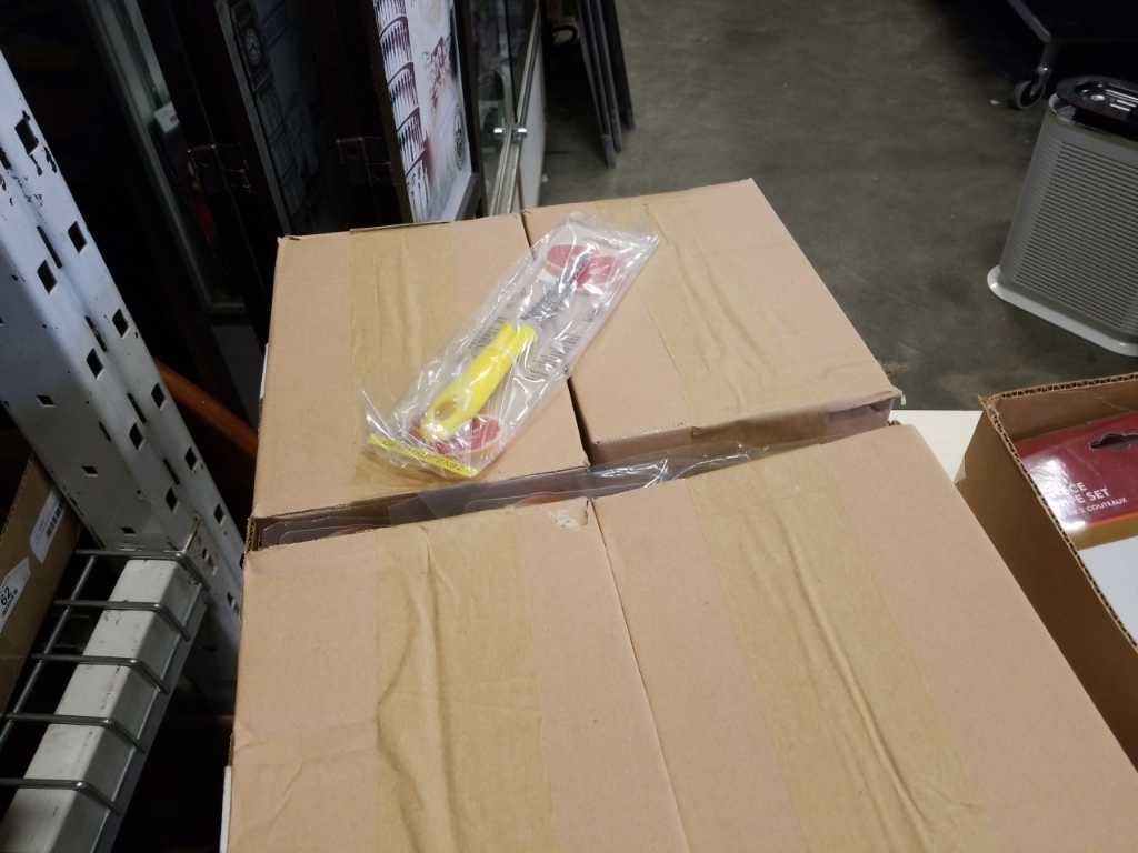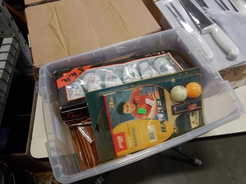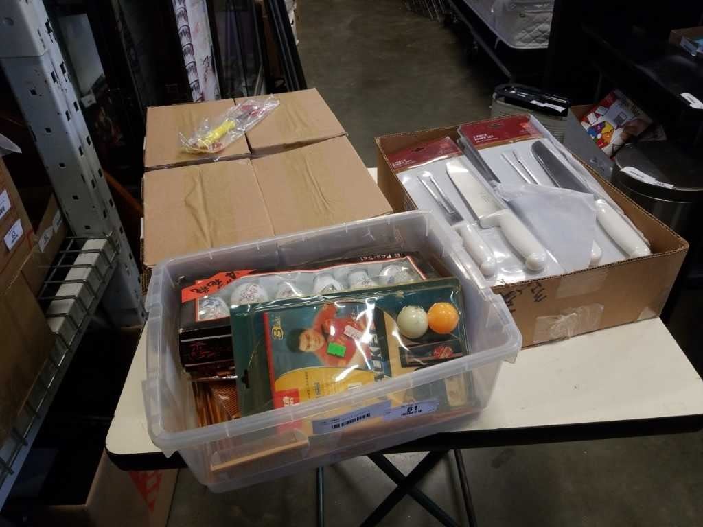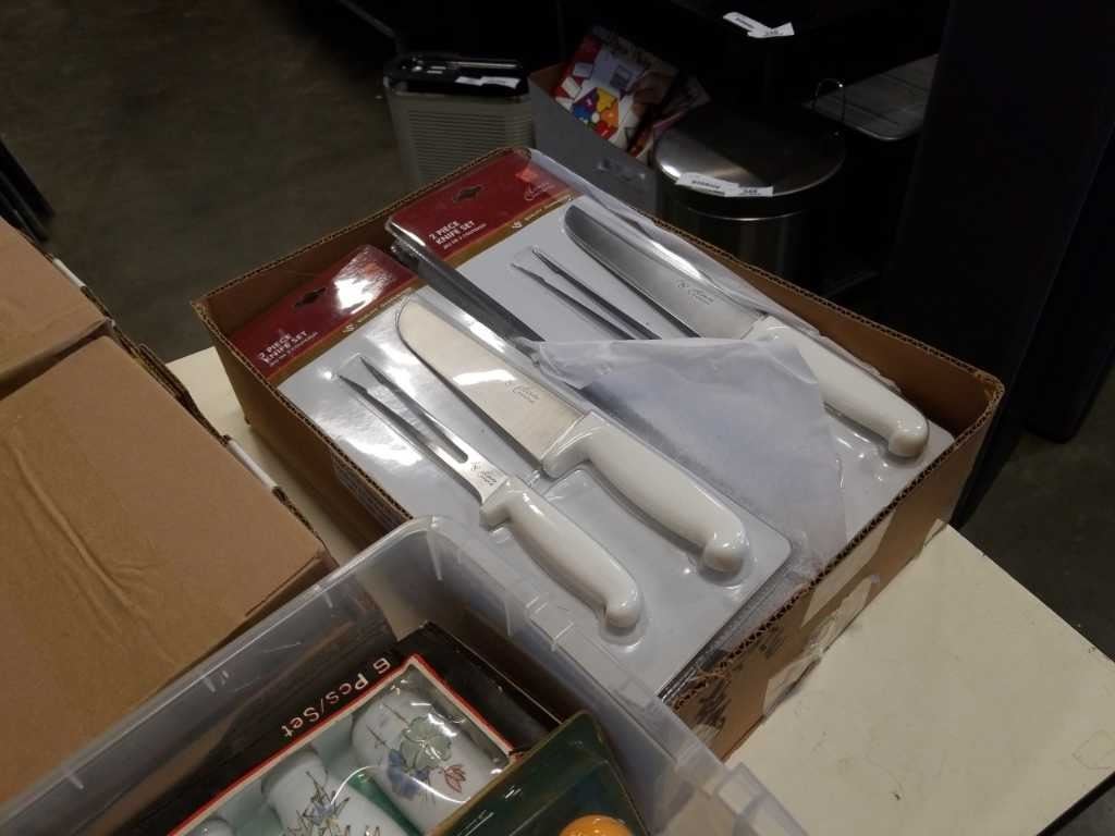 2 BOXES AND TRAY OF KNIFE SETS, COMBS, PING PONG RACKET