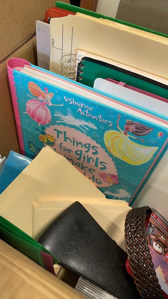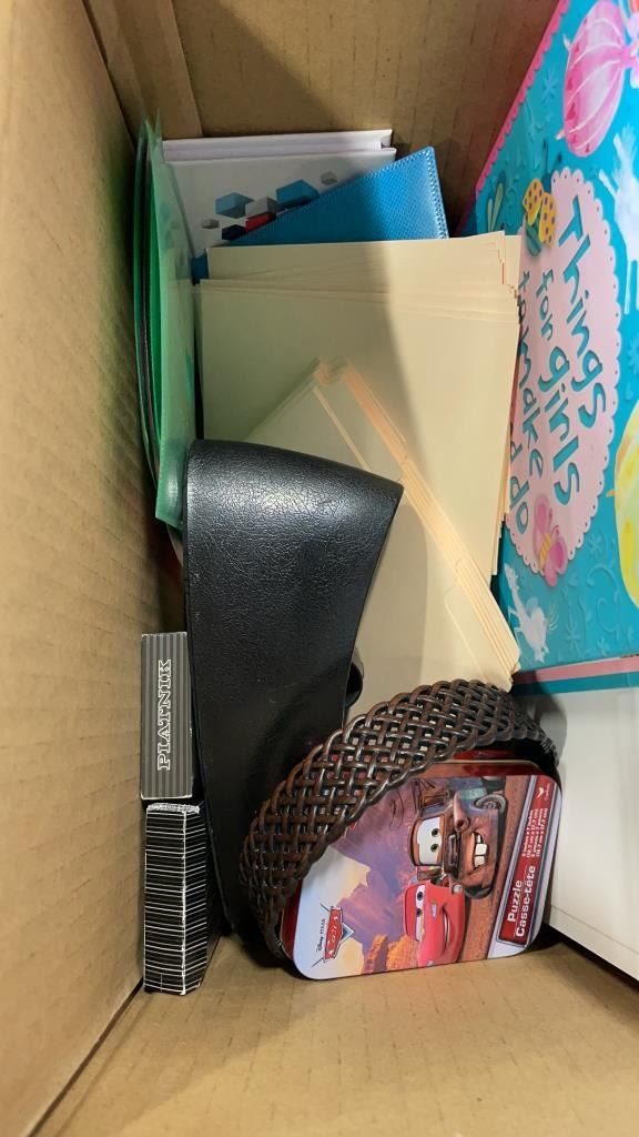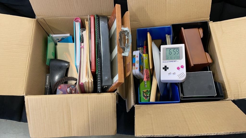 2 BOXES MISC KINDER SURPRISE, COIN BOOKS, NINTENDO GAMEBOY CLOCK, BOOKS, GAMES, PUZZLES, AND MORE