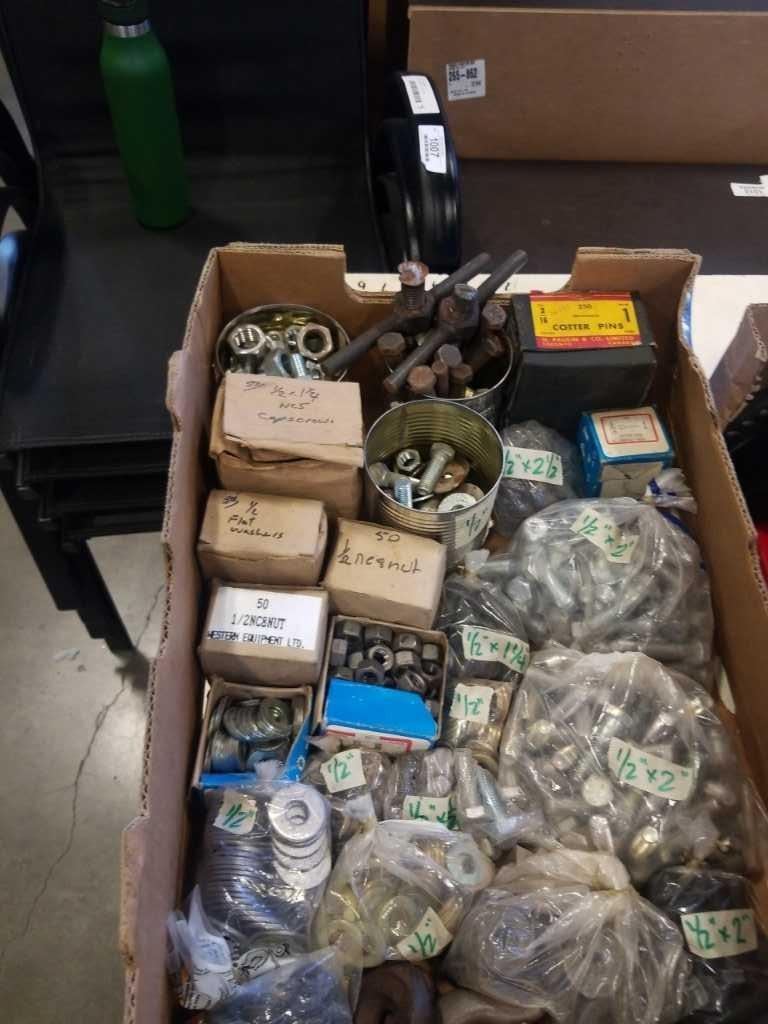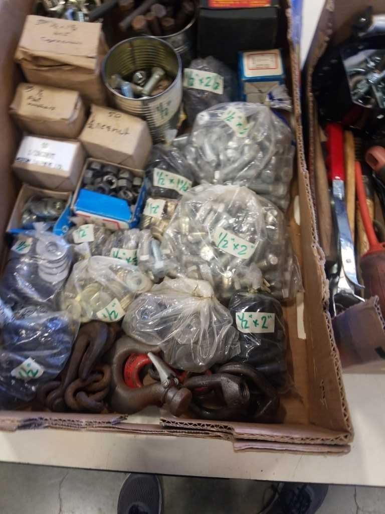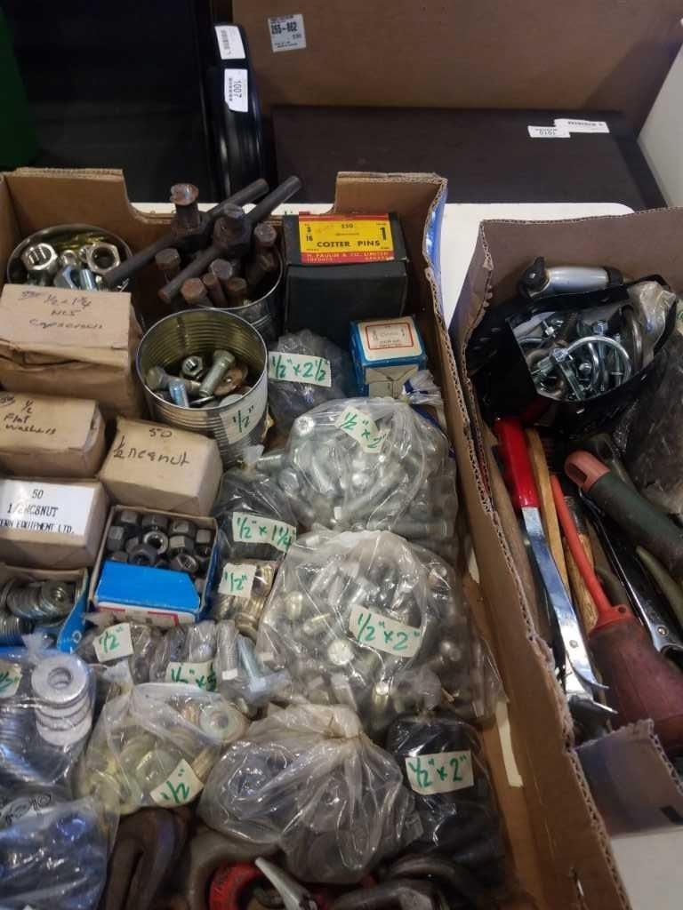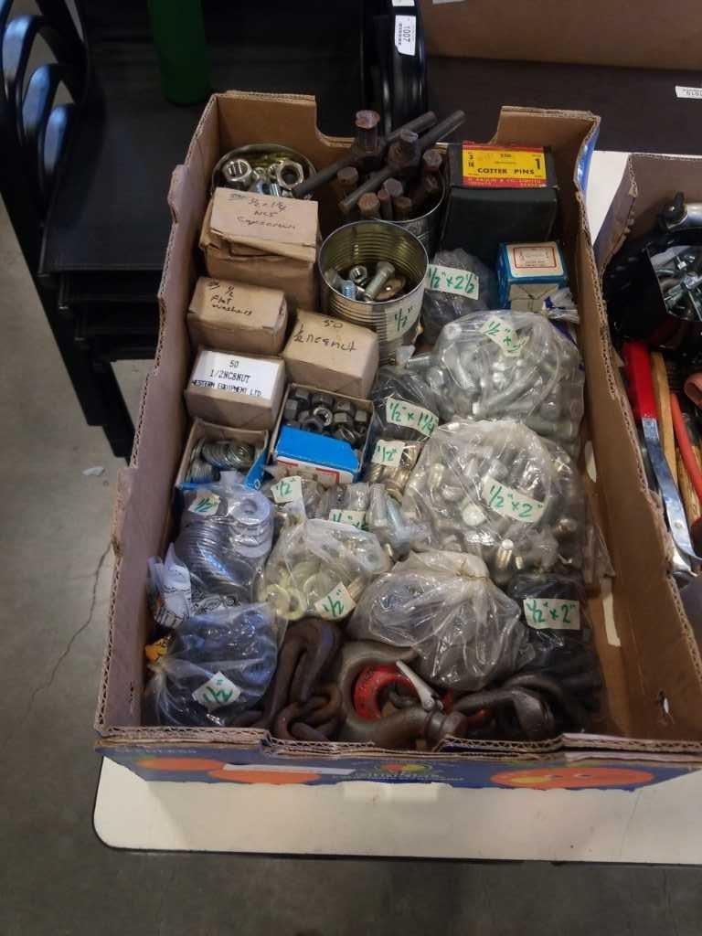 2 BOXES OF 1/2IN NUTS, BOLTS, CHAIN HOOKS, HAND TOOLS AND MORE