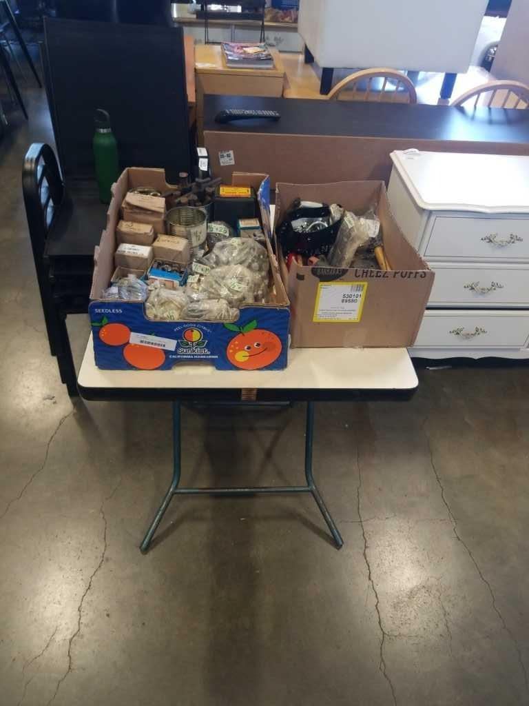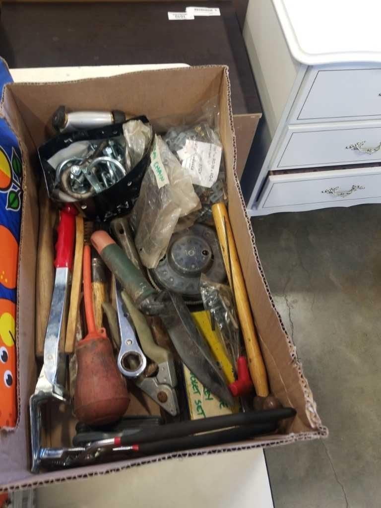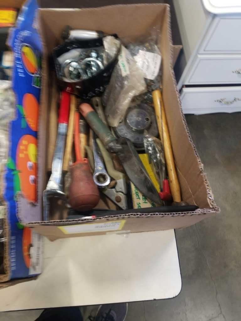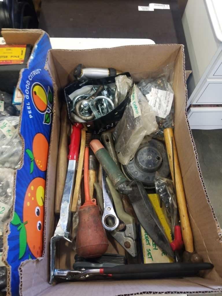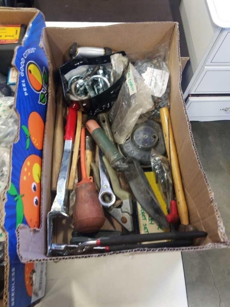 2 BOXES OF 1/2IN NUTS, BOLTS, CHAIN HOOKS, HAND TOOLS AND MORE