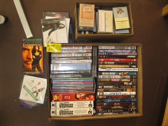 2 BOXES OF 8 TRACK TAPES, DVDs, CDs, ETC.