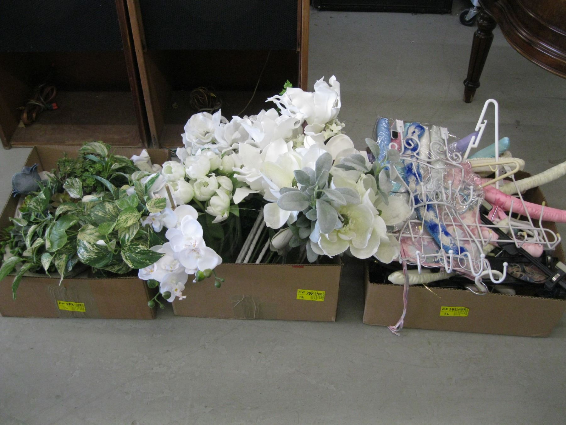 2 BOXES OF ARTIFICIAL PLANTS, BOX OF HANGERS