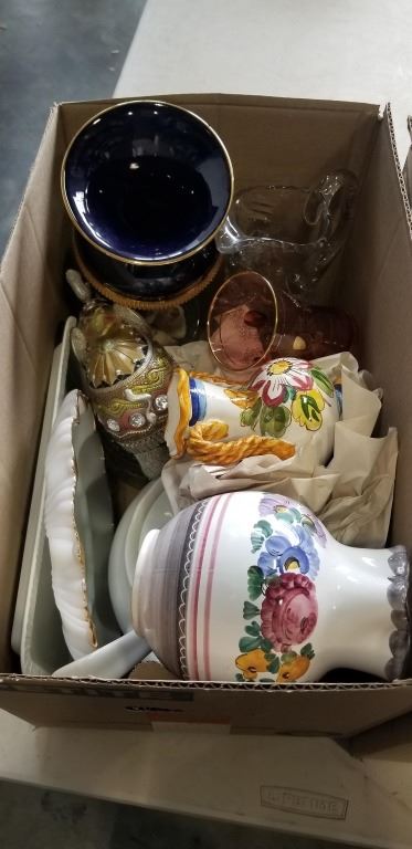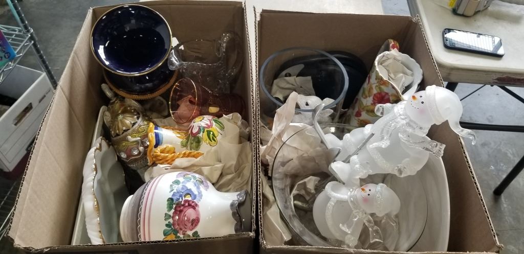 2 BOXES OF ASSORTED CHINA, CRYSTALS, FIGURES, ETC