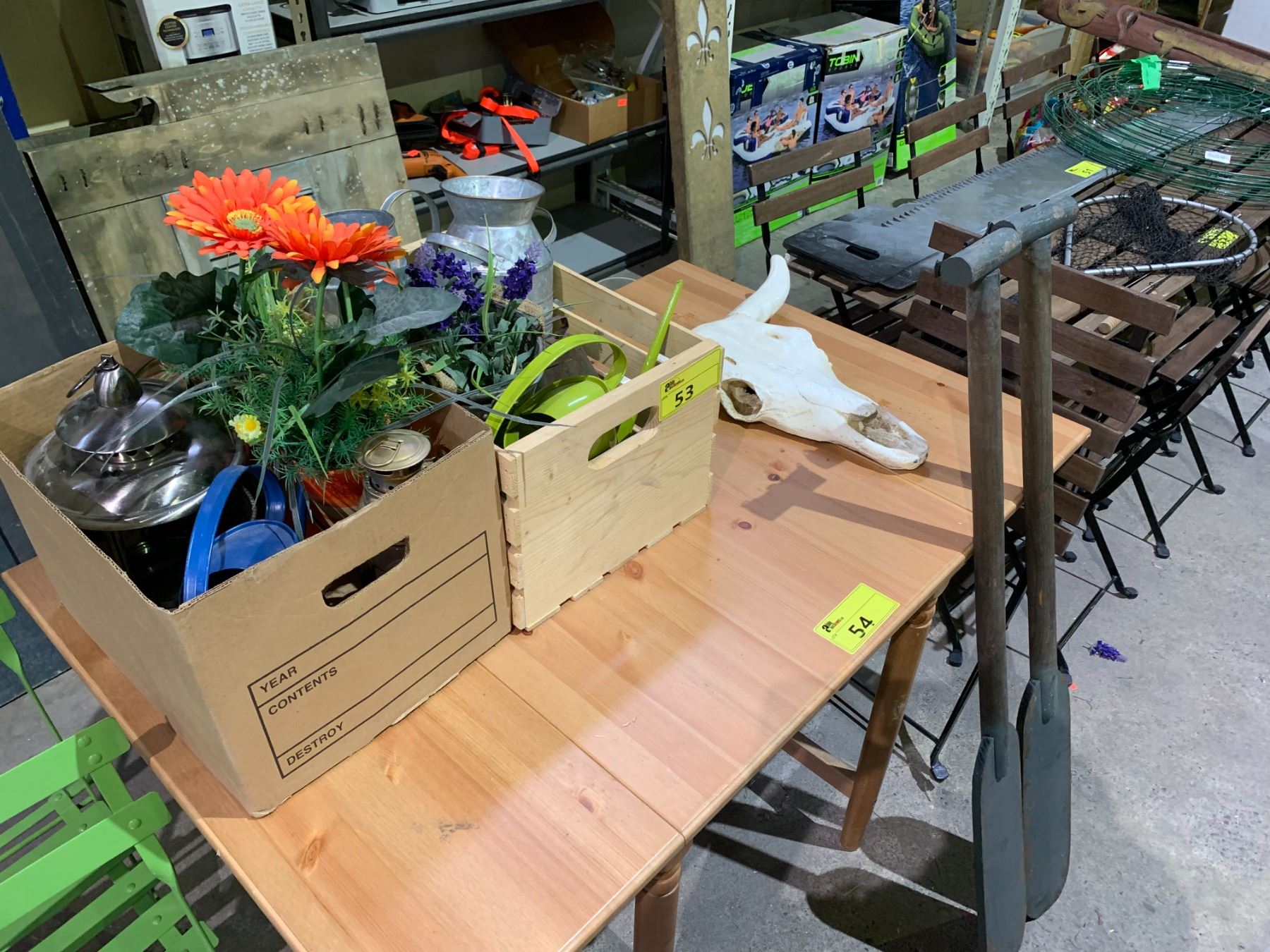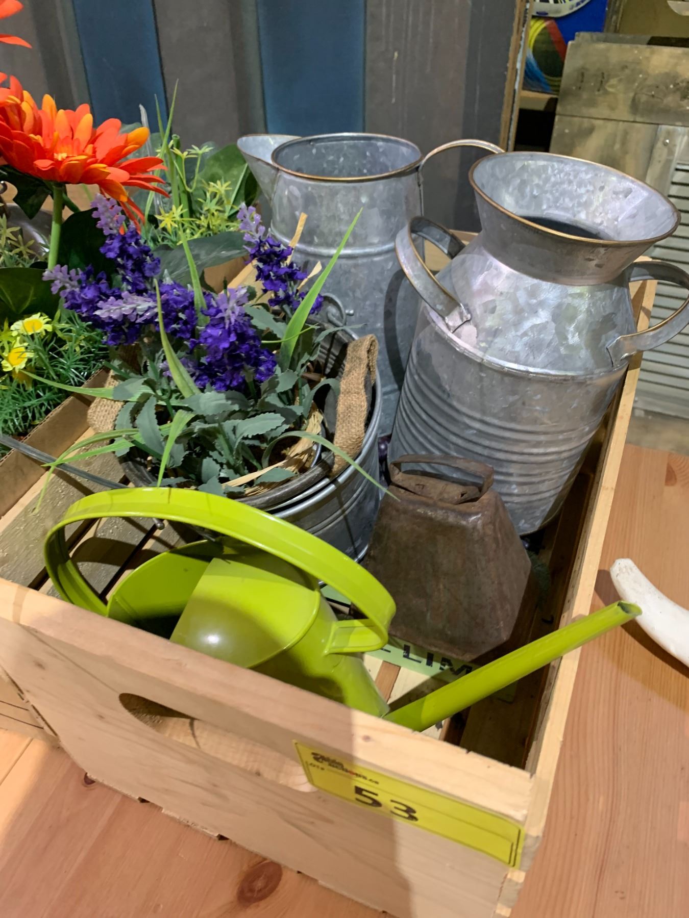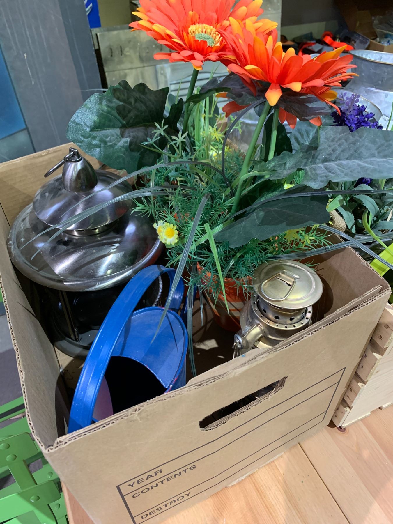 2 BOXES OF ASSORTED PLANTER POTS, FAUX PLANTS, WATERING CANS & MORE & SKULL WALL DECOR