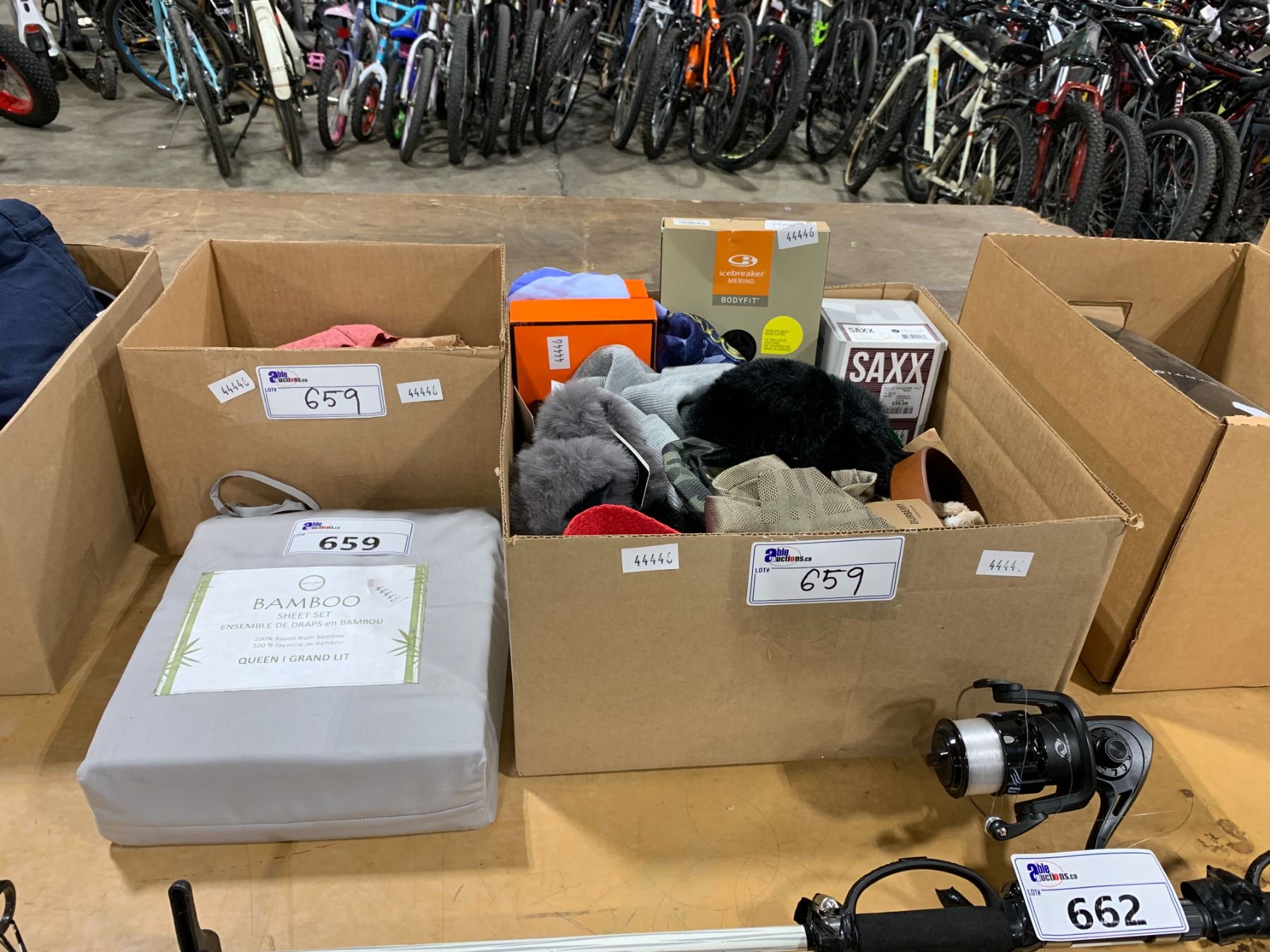 2 BOXES OF ASSORTED QUICK DRY MESH, BODYFIT T SHIRTS, GLOBES, HATS, BELT, PANTY, BAMBOO QUEEN SIZE BED SHEET SET & MISC. CLOTHES
