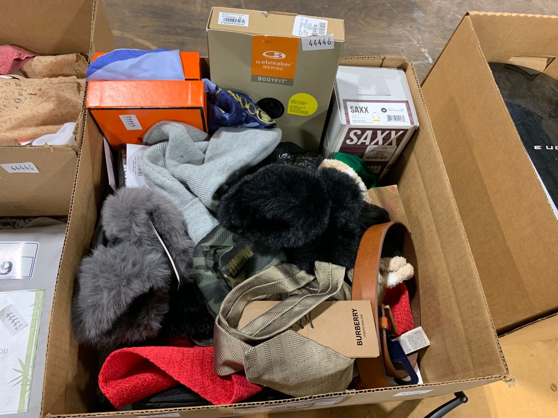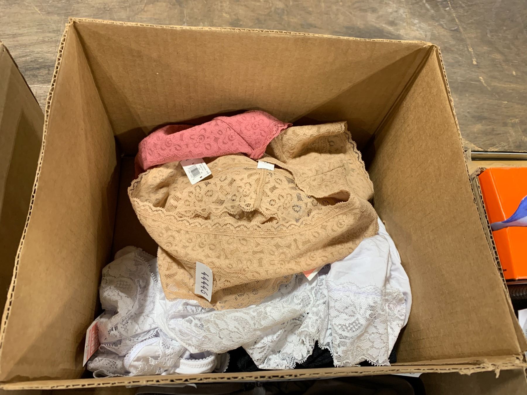 2 BOXES OF ASSORTED QUICK DRY MESH, BODYFIT T SHIRTS, GLOBES, HATS, BELT, PANTY, BAMBOO QUEEN SIZE