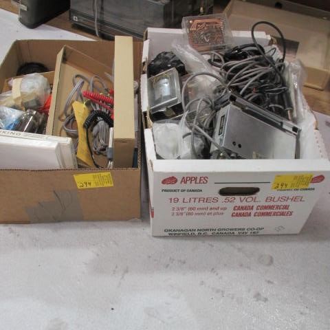 2 BOXES OF ASST. TAPES, POWER SUPPLIES, TUBES, ETC.