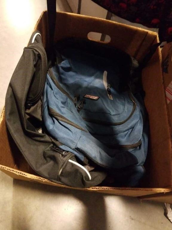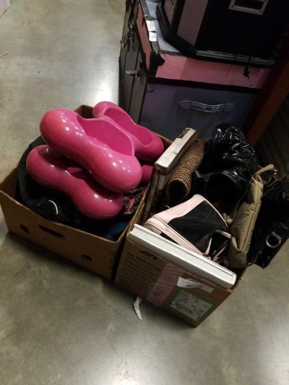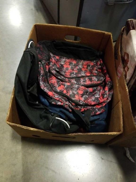 2 BOXES OF BAGS PURSES, BACKPACKS, DOG CARRIER AND 2 PET BOWL HOLDERS