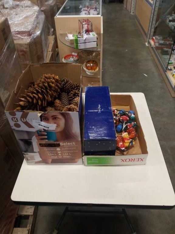 2 BOXES OF CHRISTMAS LIGHTS, DECOR AND DECORATIVE PINECONES