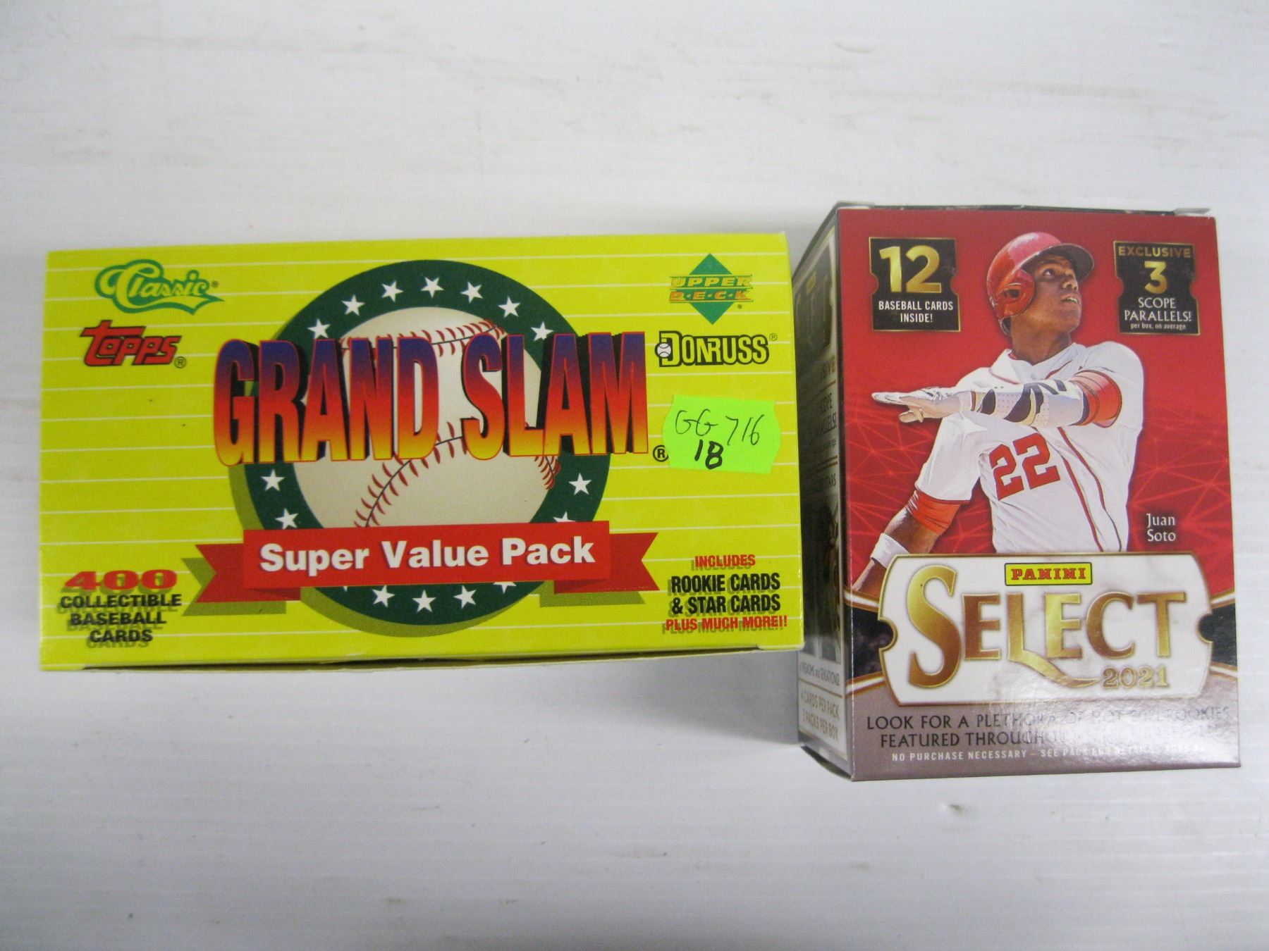 2 BOXES OF COLLECTOR CARDS, 1 IS SELECT 2021 BASEBALL CARDS & 1 GRAND SLAM BASEBALL CARDS