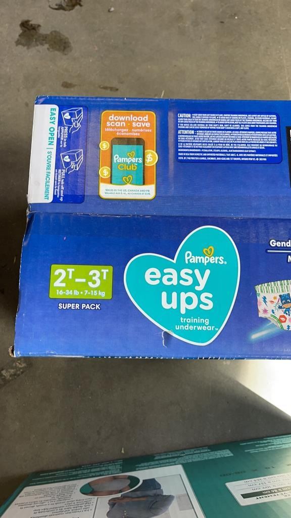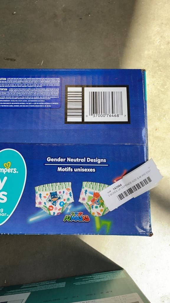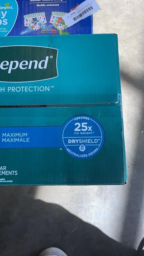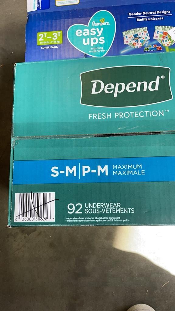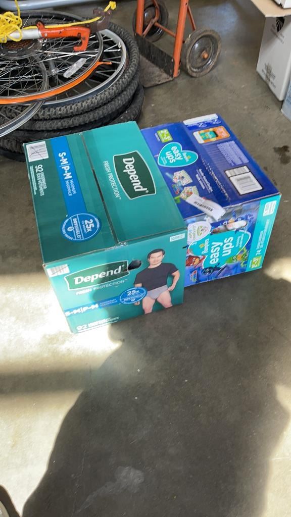 2 BOXES OF DEPENDS SIZE S-M AND EASY UPS SIZE 2T-3T