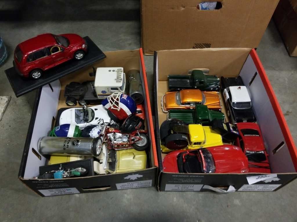 2 BOXES OF DICAST VEHICLES AND HOCKEY COLLECTIBLES