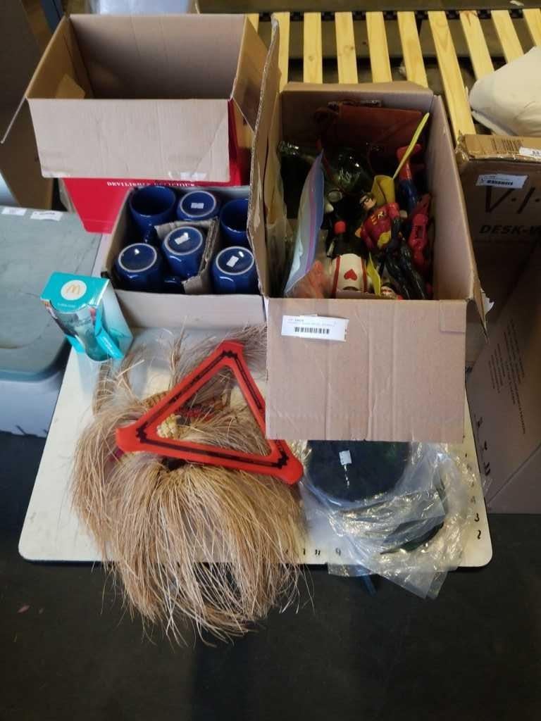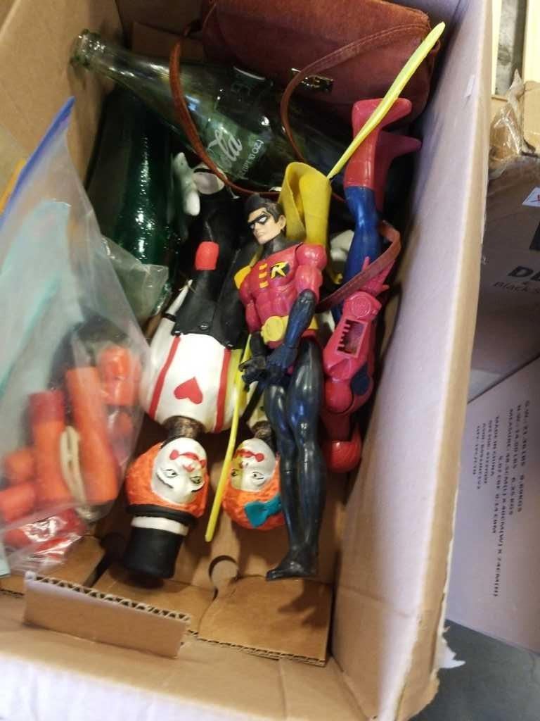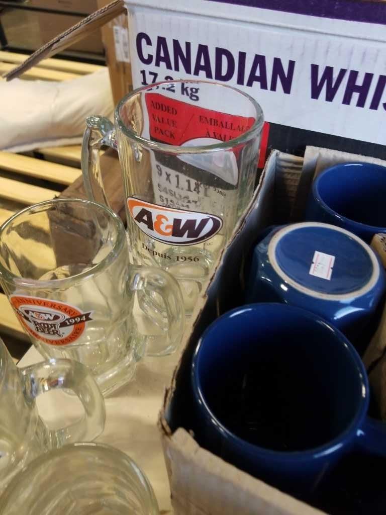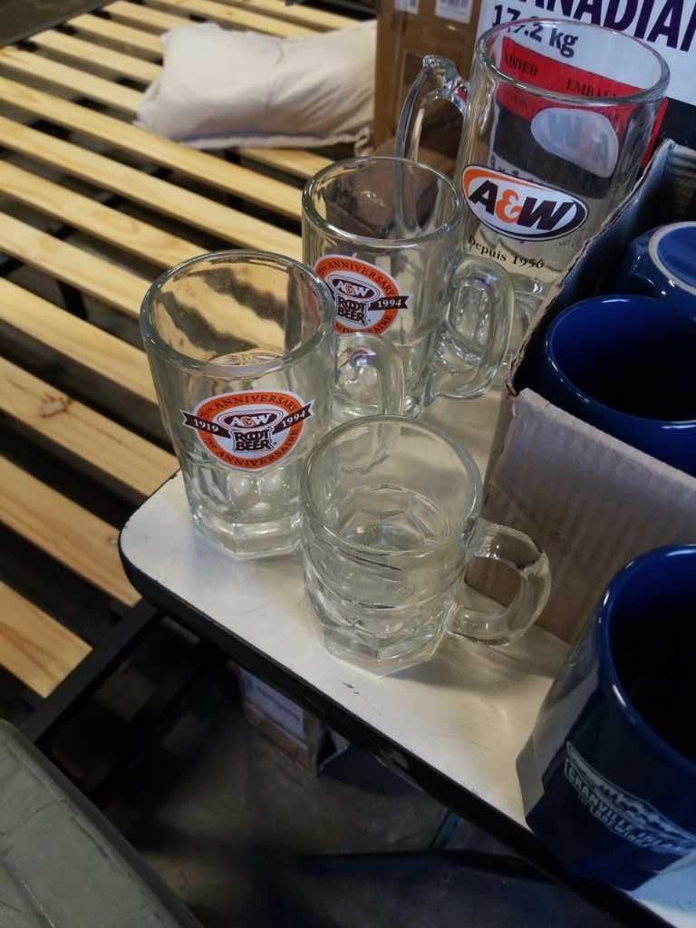 2 BOXES OF ESTATE GOODS - GRANVILLE ISLANDMUGS, A&W GLASSES, VINTAGE CAMPING SAW, AND TOYS
