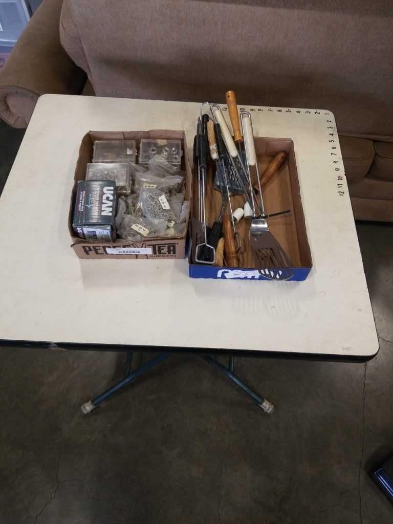 2 BOXES OF FASTENERS AND BBQ TOOLS