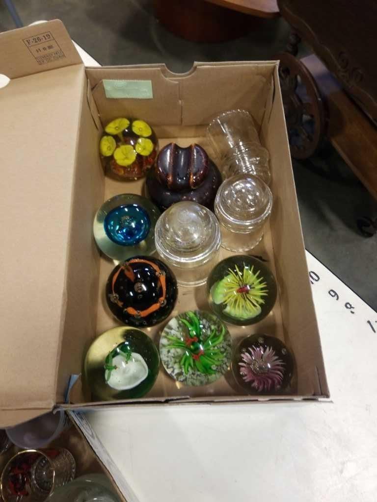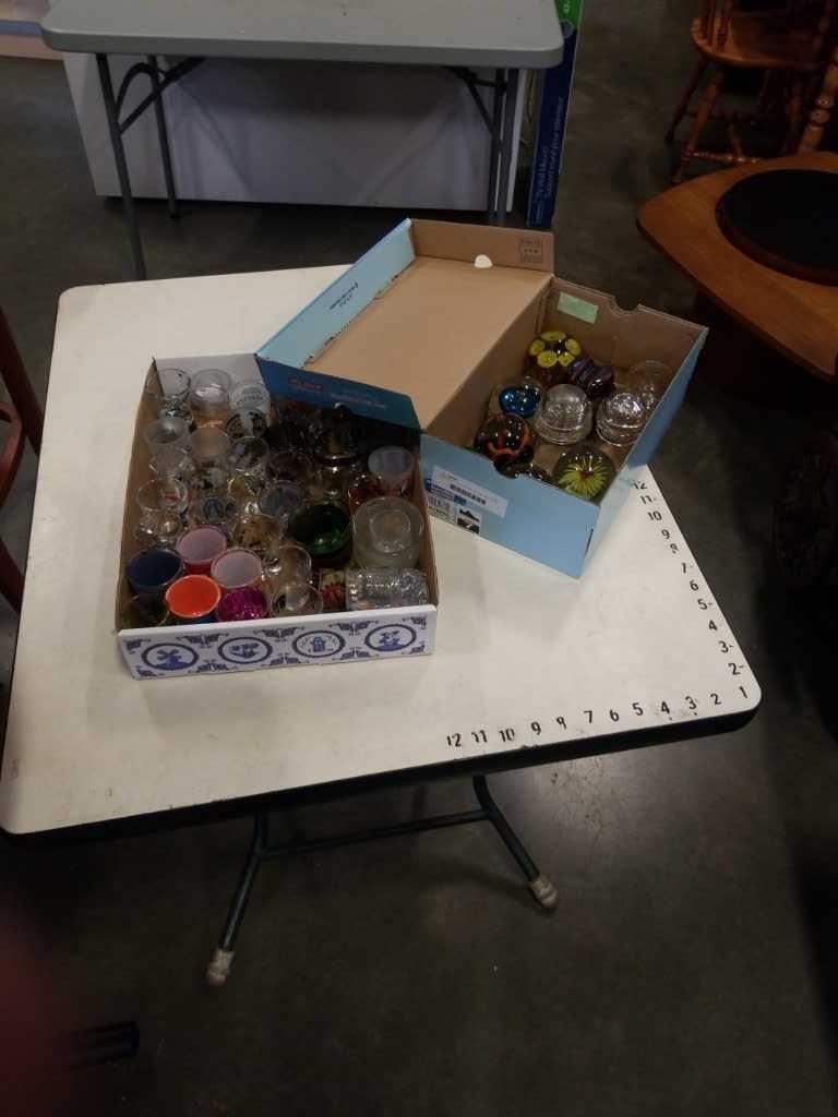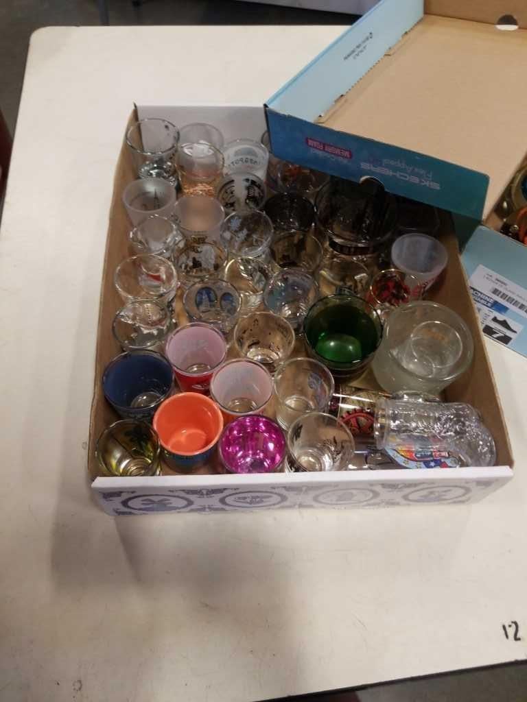 2 BOXES OF GLASS INSULATORS AND SHOT GLASSES