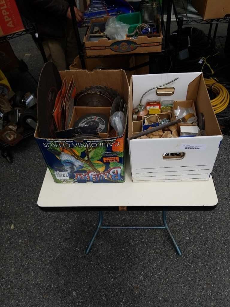 2 BOXES OF HARDWARE, GRINDING DISCS, SAW BLADES AND MORE