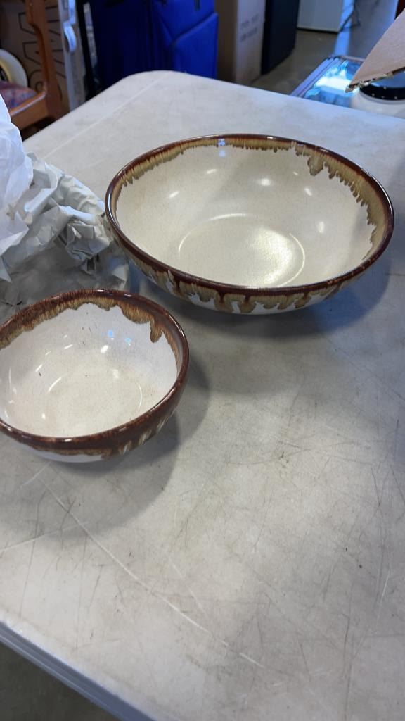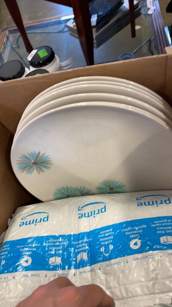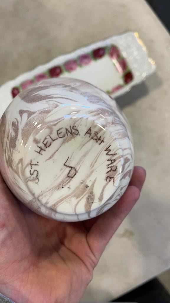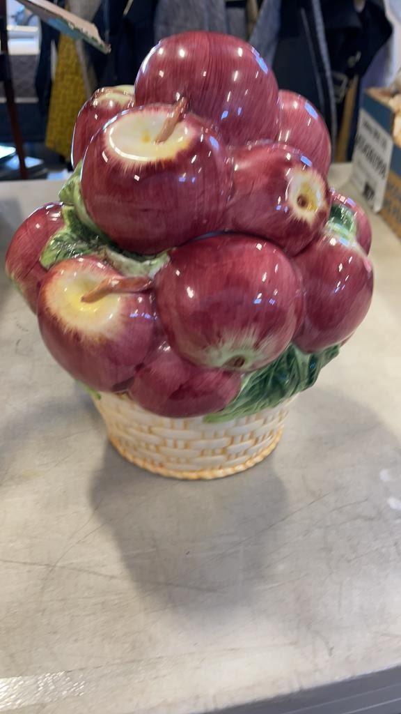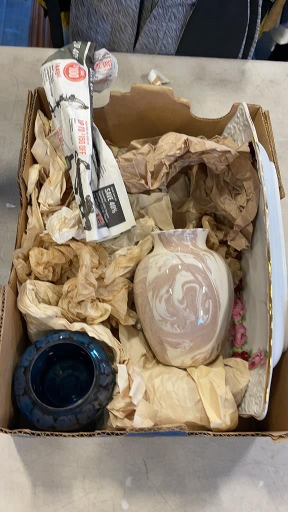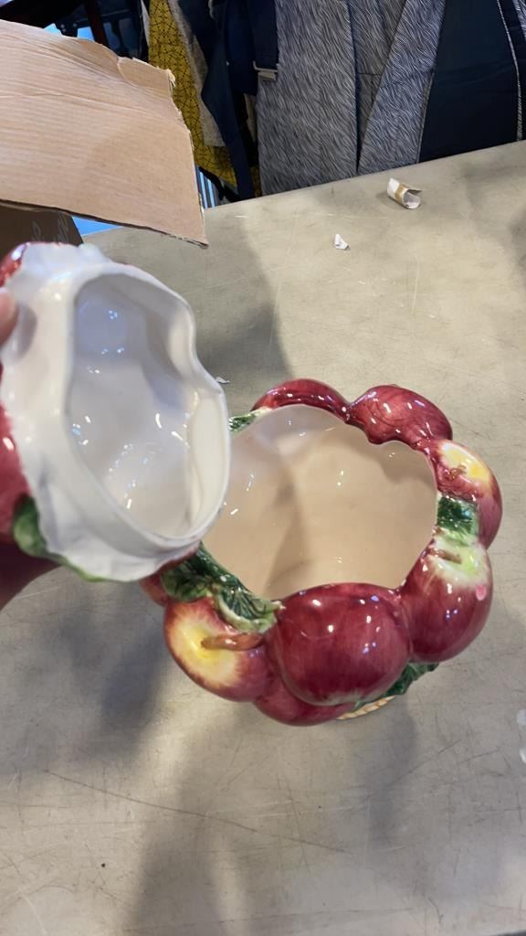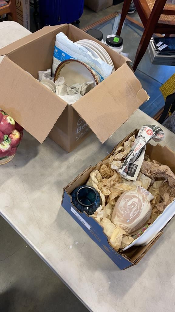 2 BOXES OF IRONSTONE DISHES, COOKIE JAR AND MT ST HELENS ASHWARE JAR
