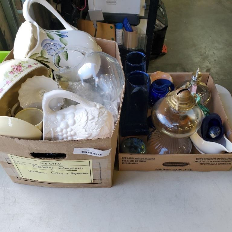 2 BOXES OF JUGS, AND COLLECTIBLES