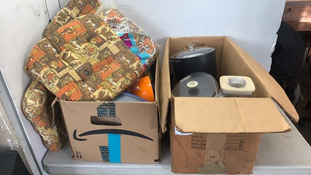 2 BOXES OF KITCHEN ITEMS, APPLIANCES AND CUSHIONS