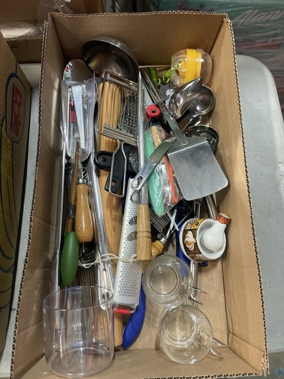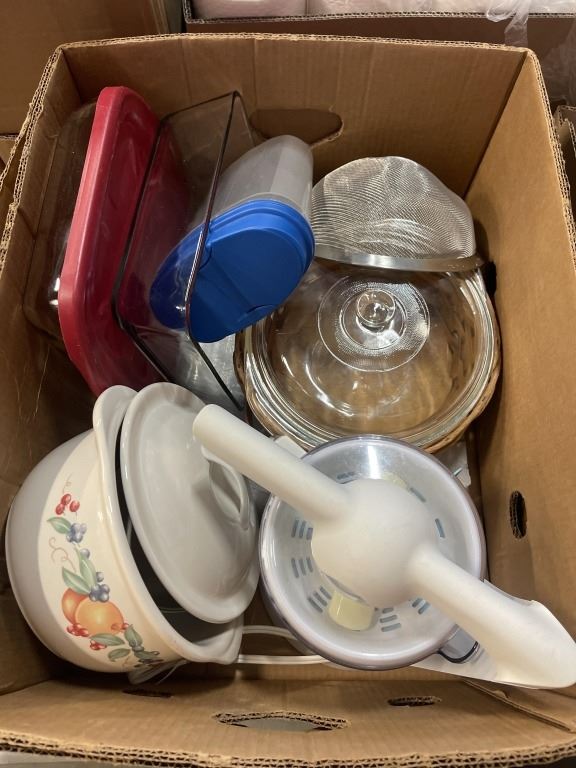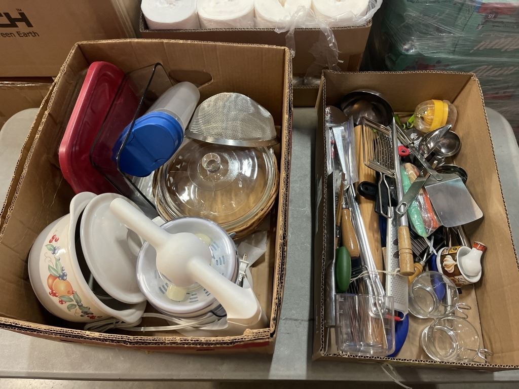 2 BOXES OF KITCHEN SUPPLIES AND SERVING ITEMS