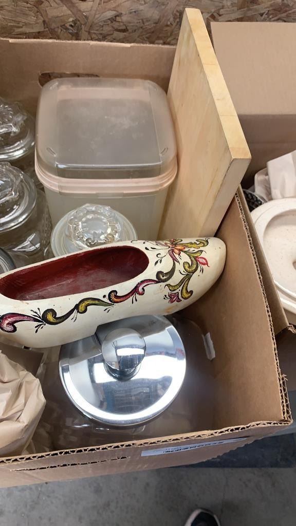 2 BOXES OF LIDDED GLASS AND CERAMIC CANNISTERS, AND KITCHEN ITEMS