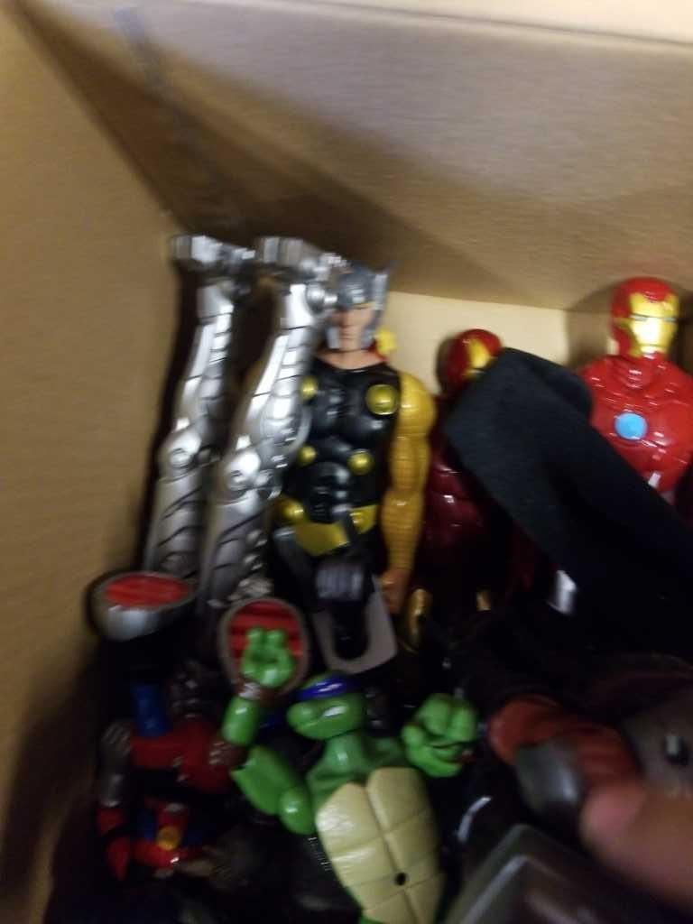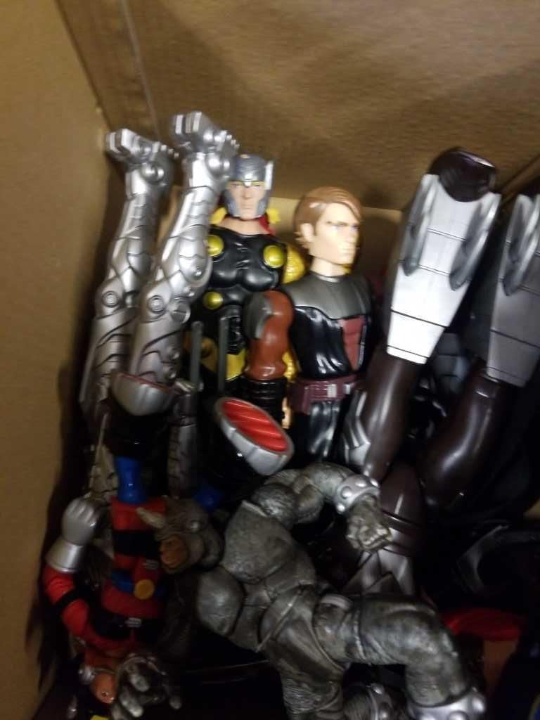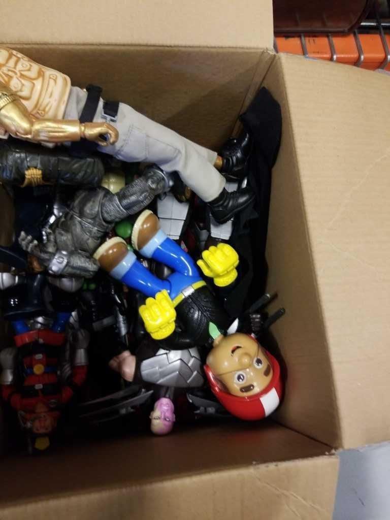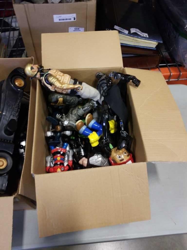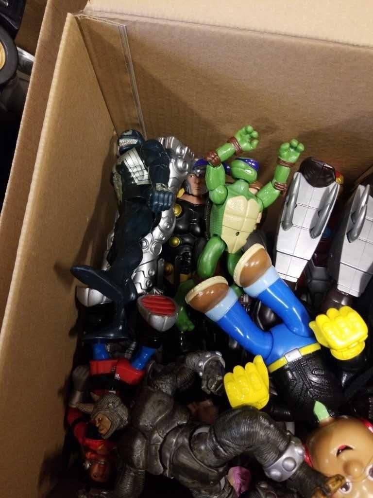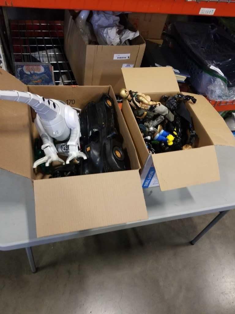 2 BOXES OF MARVEL ACTION FIGURES AND RC DINOSAUR