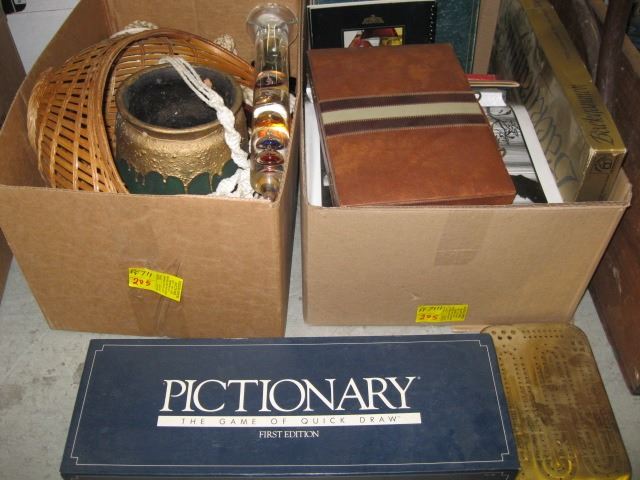 2 BOXES OF MISC. GLASS THERMOMETER, GAMES, PLANTERS, ETC.