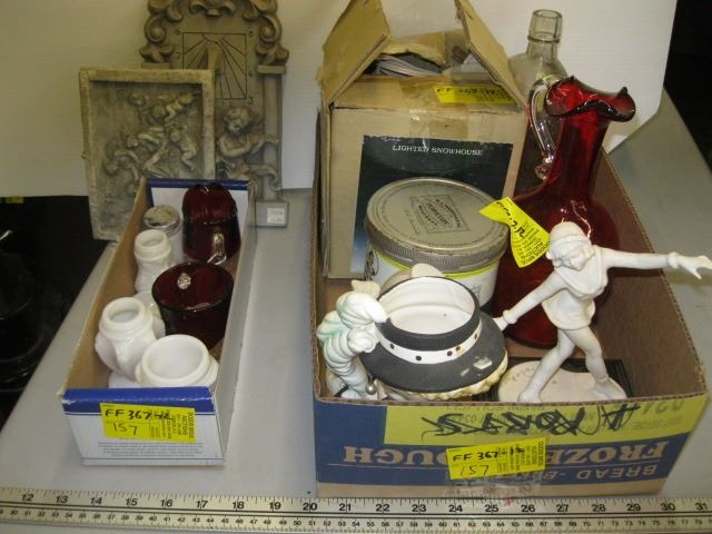 2 BOXES OF MISC. - HEAD VASE FIGURINES, MILK GLASS, ETC.