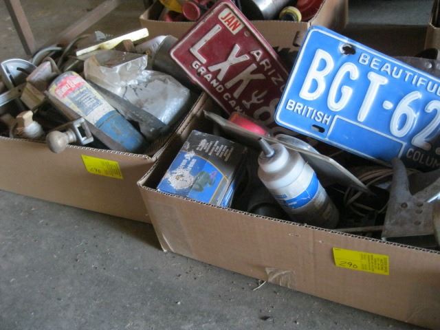 2 BOXES OF MISC LICENCE PLATES, KNEE PADS, PLUMB BOB ETC.