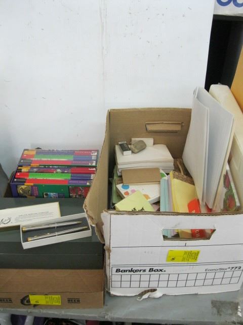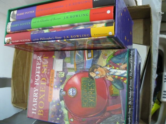 2 BOXES OF MISC POST IT NOTES, HARRY POTTER BOOKS ETC.