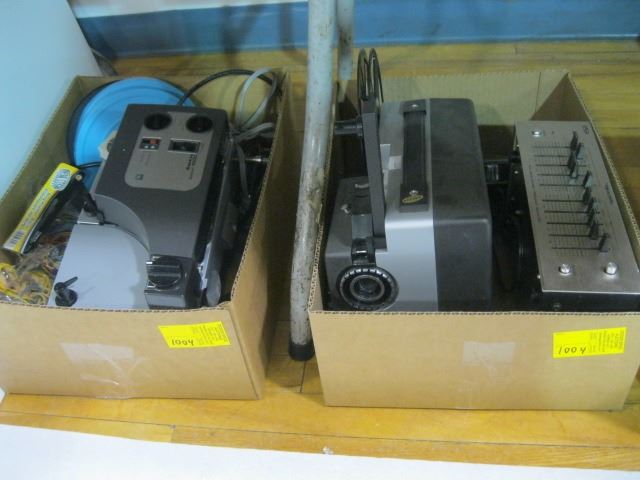 2 BOXES OF MISC. PROJECTORRS, REALISTIC EQUALIZER, ETC.