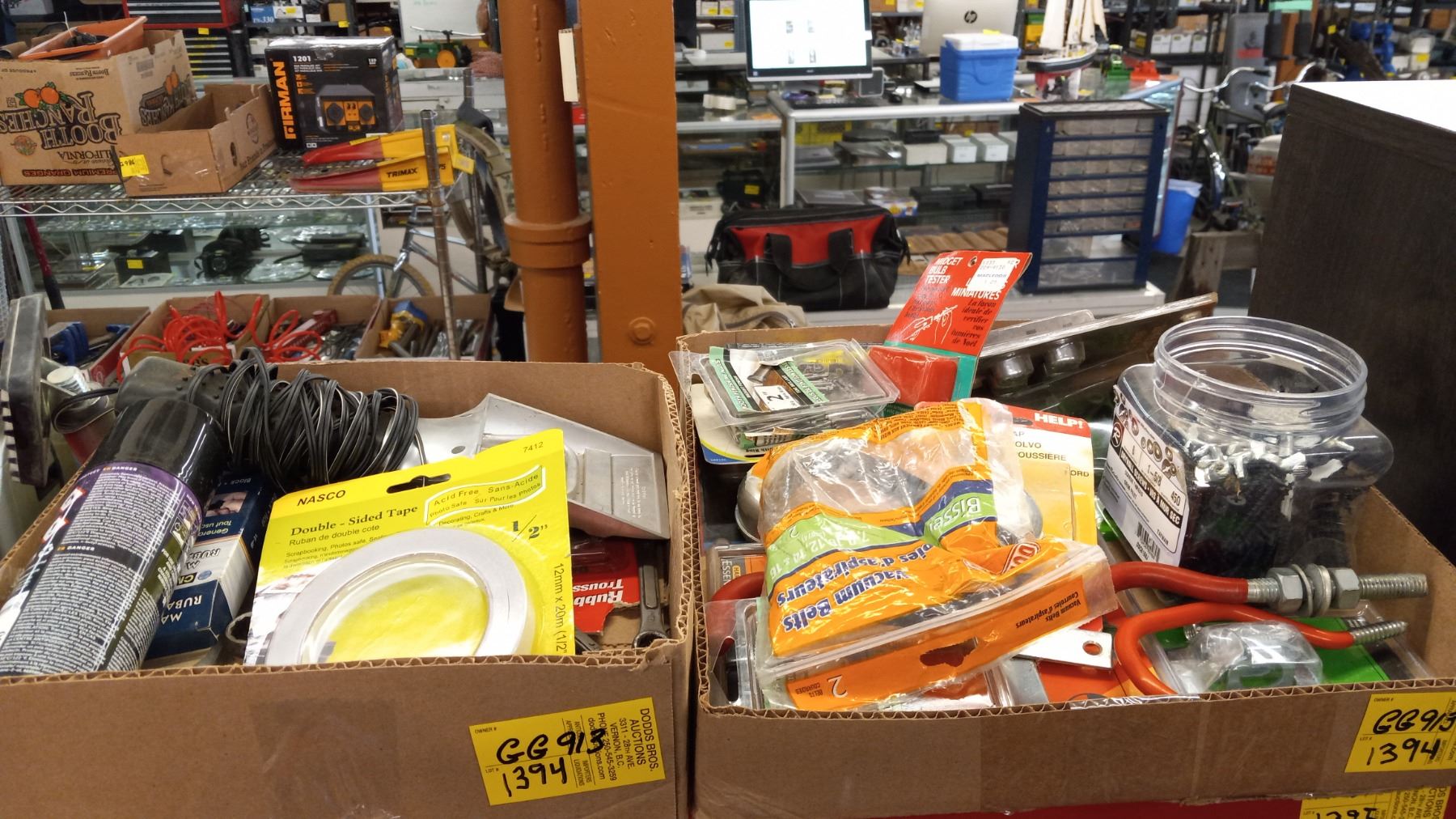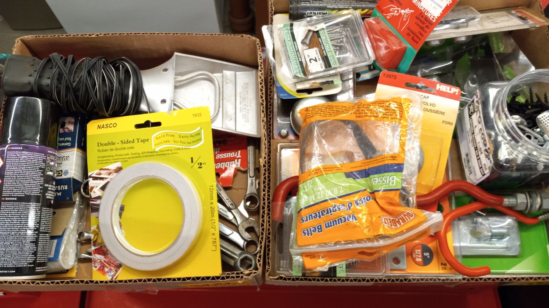 2 BOXES OF MISC. SCREWS, WRENCHES, DE-ICER, ETC.