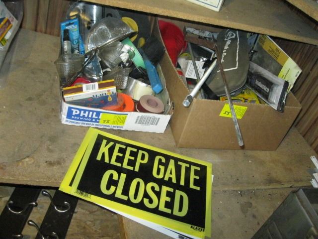 2 BOXES OF MISC. SIGNS, FLAGGING TAPE, GOGGLES, ETC.