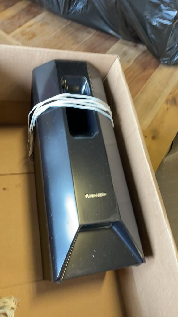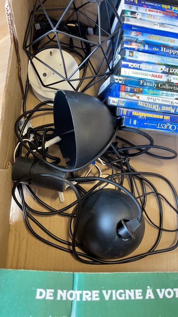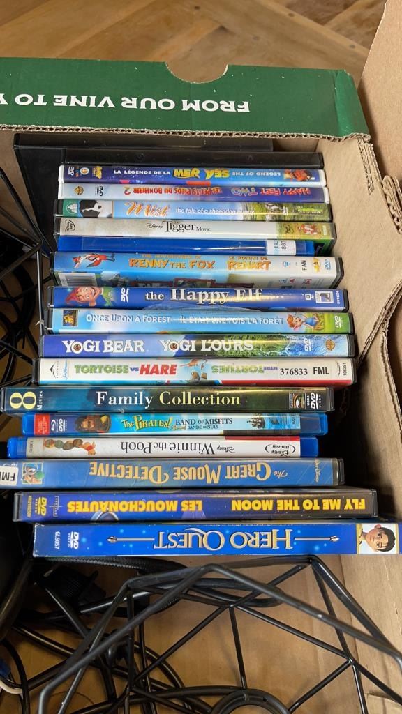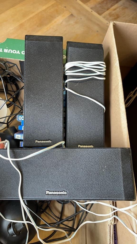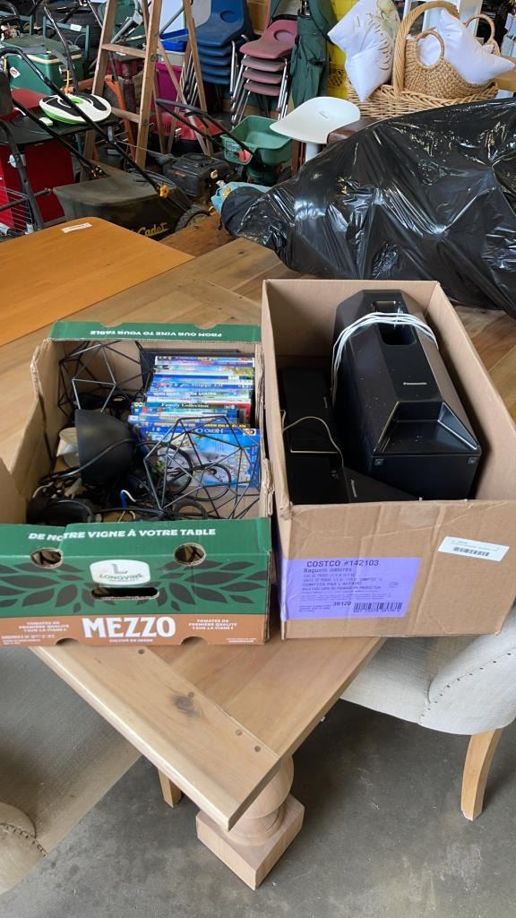 2 BOXES OF PANASONIC SPEAKERS, DVDS, AND WIRE LIGHTS