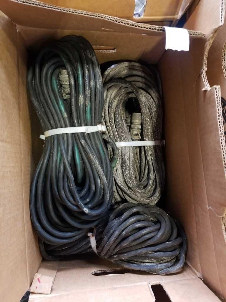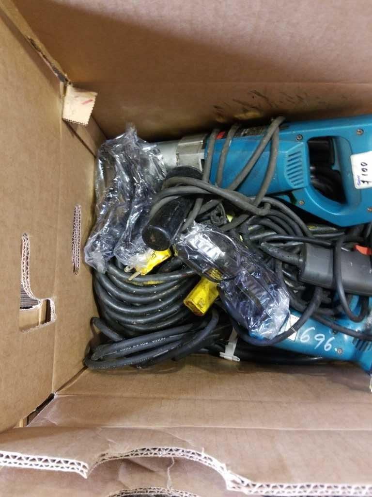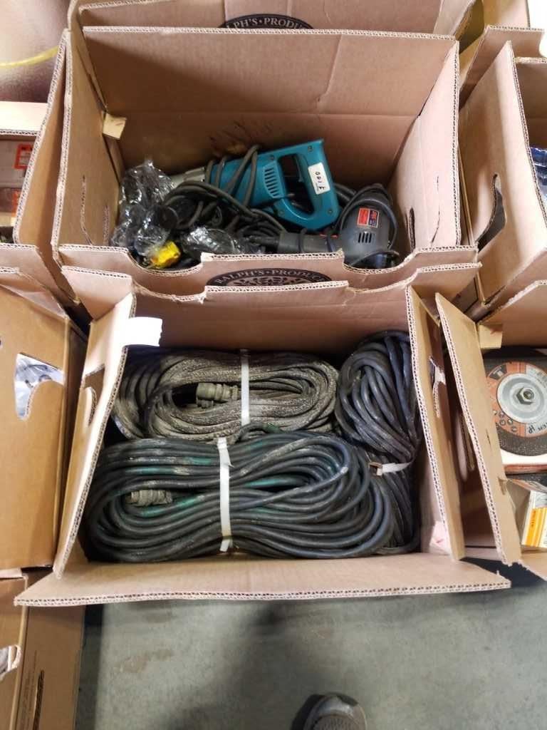 2 BOXES OF POWER TOOLS, EXTENTIONS CORDS, POWER CABLES