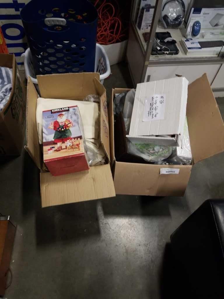 2 BOXES OF SEAT COVERS, CURTAINS, HOUSEHOLD GOODS