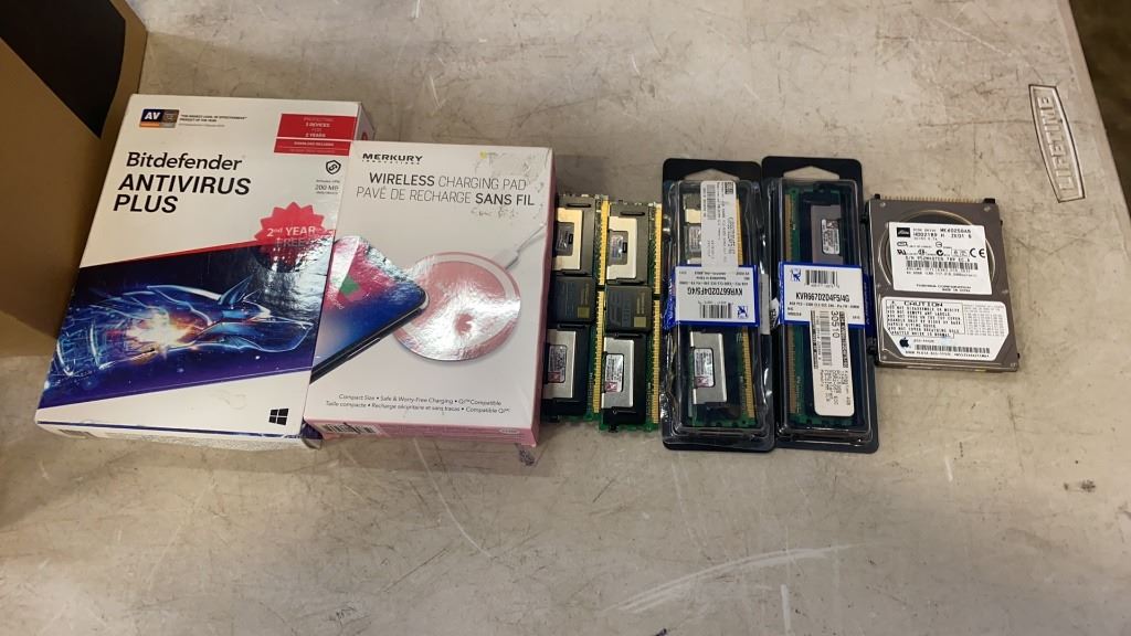 2 BOXES OF SOLAR LIGHT, WIRELESS CHARGER AND COMPUTER RAM